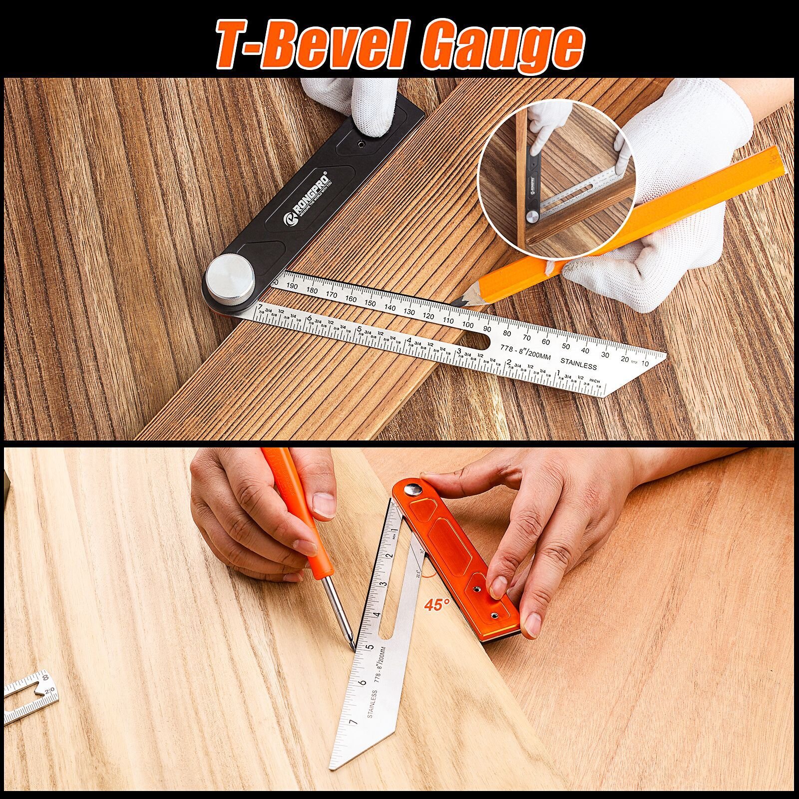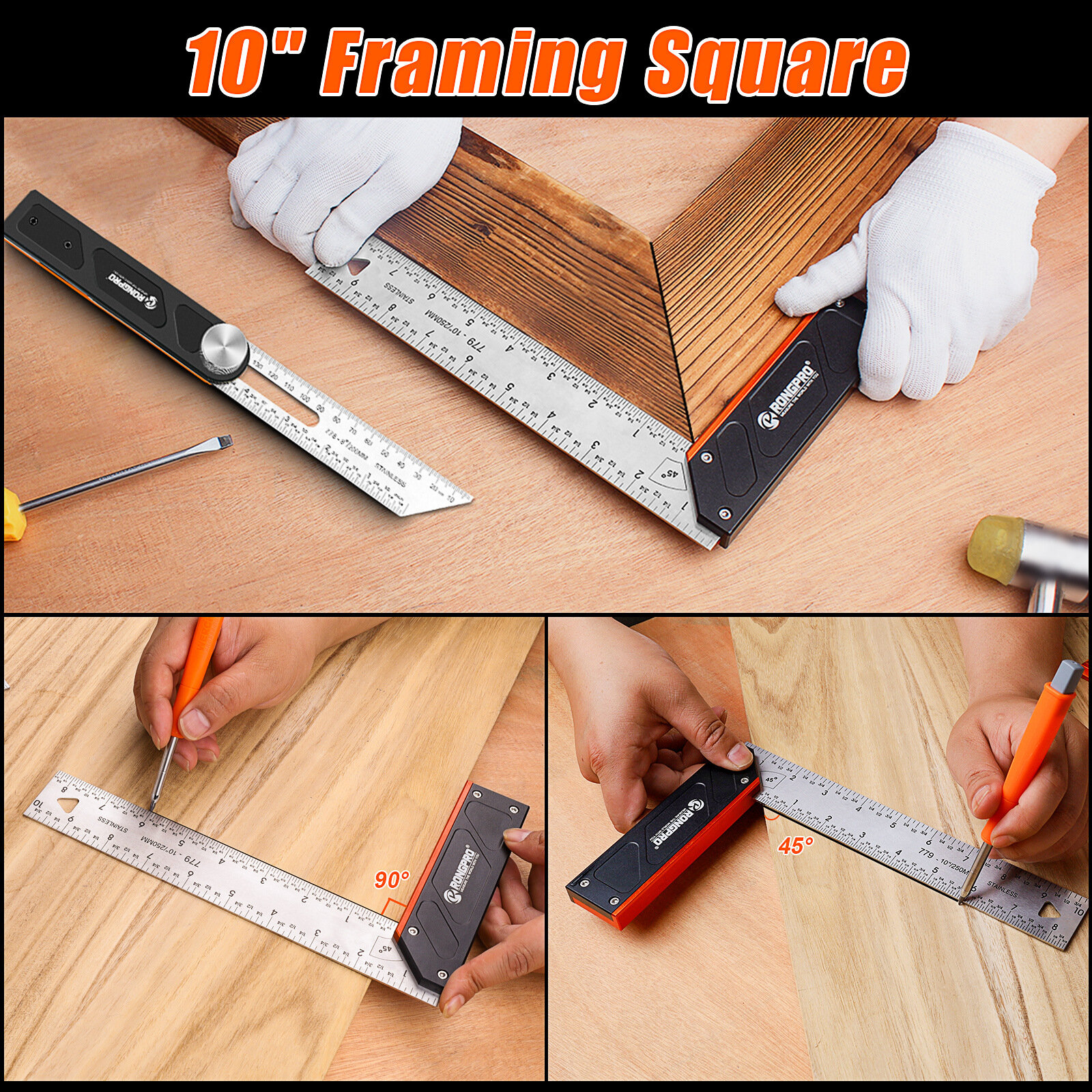 1.Precision Engineering: Built with high-quality aluminum alloy and stainless steel, ensuring accurate measurements for both metric and imperial scales. Perfect for woodworking, construction, and DIY projects. 2.Multi-Functional Design: Includes a 10u201d framing square, 7u201d carpenter square, 8u201d protractor, and adjustable T-bevel gauge, making it versatile for angle finding, straight edge marking, and center measurement tasks. 3.Laser-Etched Markings: Permanent etching ensures measurement visibility in all lighting conditions without fading over time, delivering reliable performance for everyday use. 4.Ergonomic Handling: Engineered for easy grip during use, with lightweight materials that balance strength and functionality, allowing for extended periods of use without discomfort. 5.Easy Adjustability: Features a smooth, lockable knob on the T-bevel gauge and protractor for secure angle settings, enhancing speed and repeatability during woodworking projects.