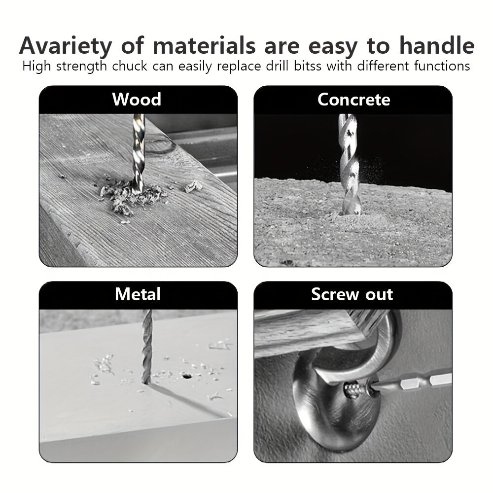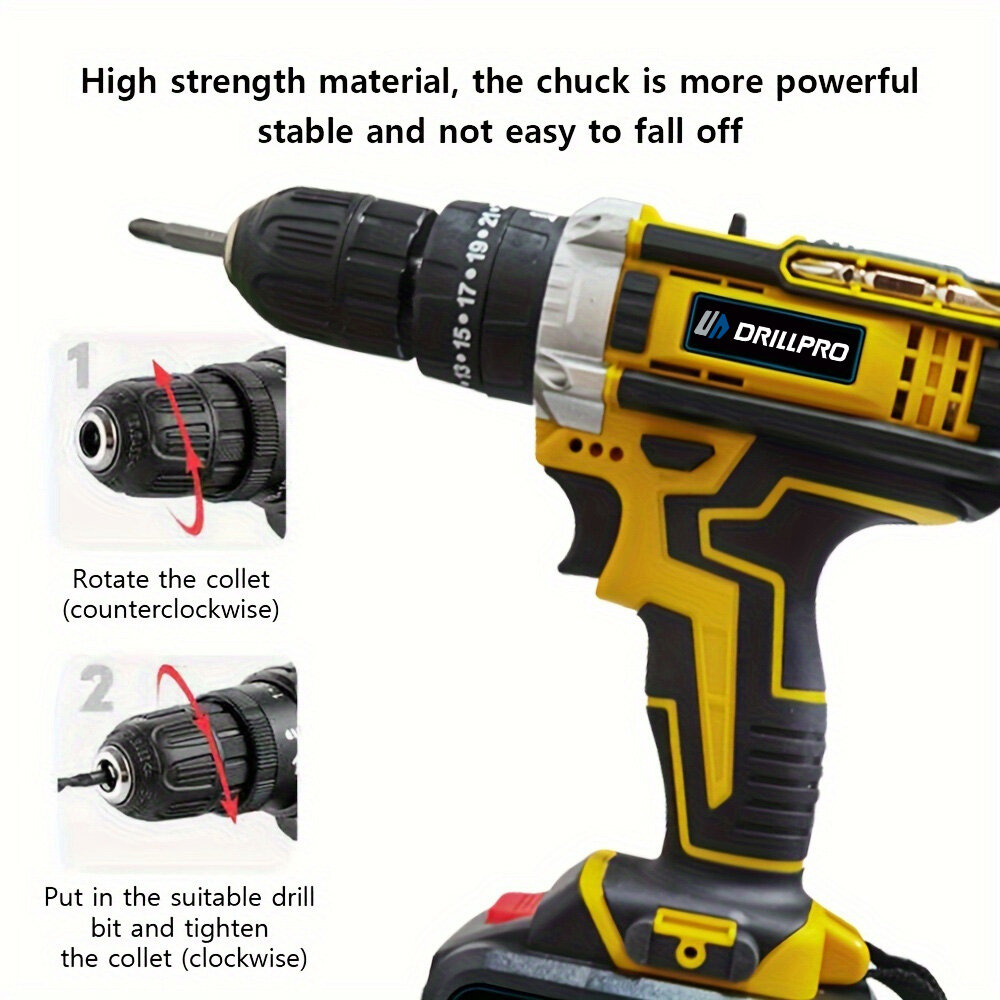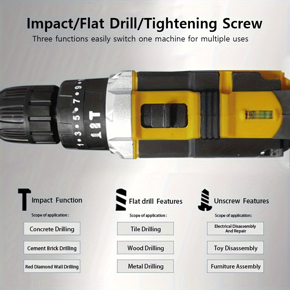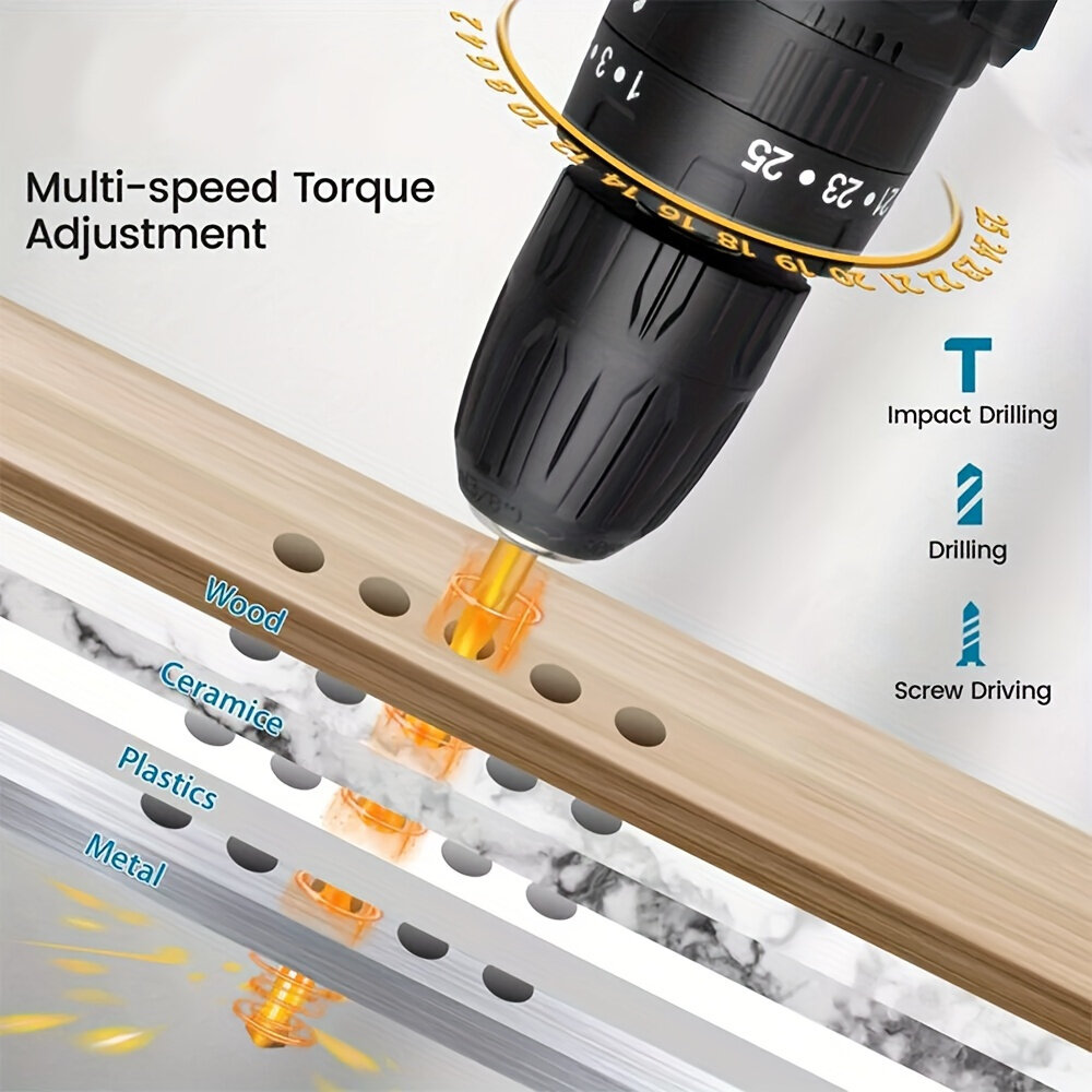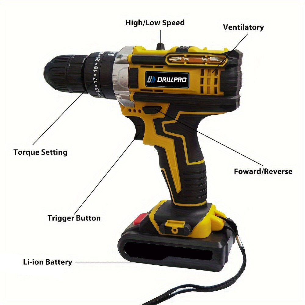 1.High-Efficiency Motor with Variable Speed Our 21V Cordless Drill is equipped with a high-efficiency motor that offers 2-variable speeds, allowing you to switch speed. Whether you"re performing delicate screw driving tasks or heavy-duty drilling, you have full control over the speed to match any application. 2.Versatile 25-Position Clutch The 25-position 3-clutch torque adjustment offers precise control for fastening applications to prevent stripping screws and ensure professional results. Each setting allows you to fine-tune the torque delivery, providing optimized power for various materials, including wood, metals, ceramics, and plastics. 3.Reliable Battery Performance The set includes two 1300mAh batteries, ensuring that you always have a spare ready to go. The enhanced battery life supports long hours of work without frequent interruptions. The batteries are compatible with Dewalt, making them a versatile addition to your tool kit. 4.Built-In LED Work Light The integrated work light shines bright in dark or confined spaces, improving visibility and ensuring precision even in low-light environments. This feature is essential for tasks carried out in basements, attics, and during night-time projects. 5.Ergonomic and Lightweight Design Designed for ease of use, the cordless drill features an ergonomic handle that reduces hand fatigue. Its lightweight construction ensures comfortable handling for long periods. The 3/8 inch keyless chuck allows for quick and easy bit changes, enhancing productivity on the job site.