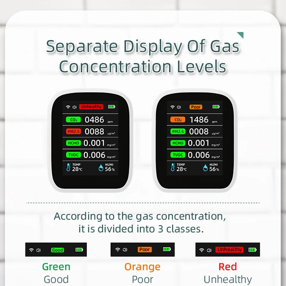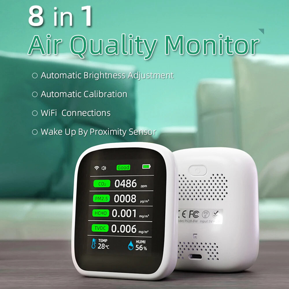 u30108-in-1 Air Quality Testeru3011: This detector can be used to test and display the concentration of PM1.0, PM2.5, PM10, CO2, TVOC, HCHO, temperature and humidity at the same time. And also has WiFi function.