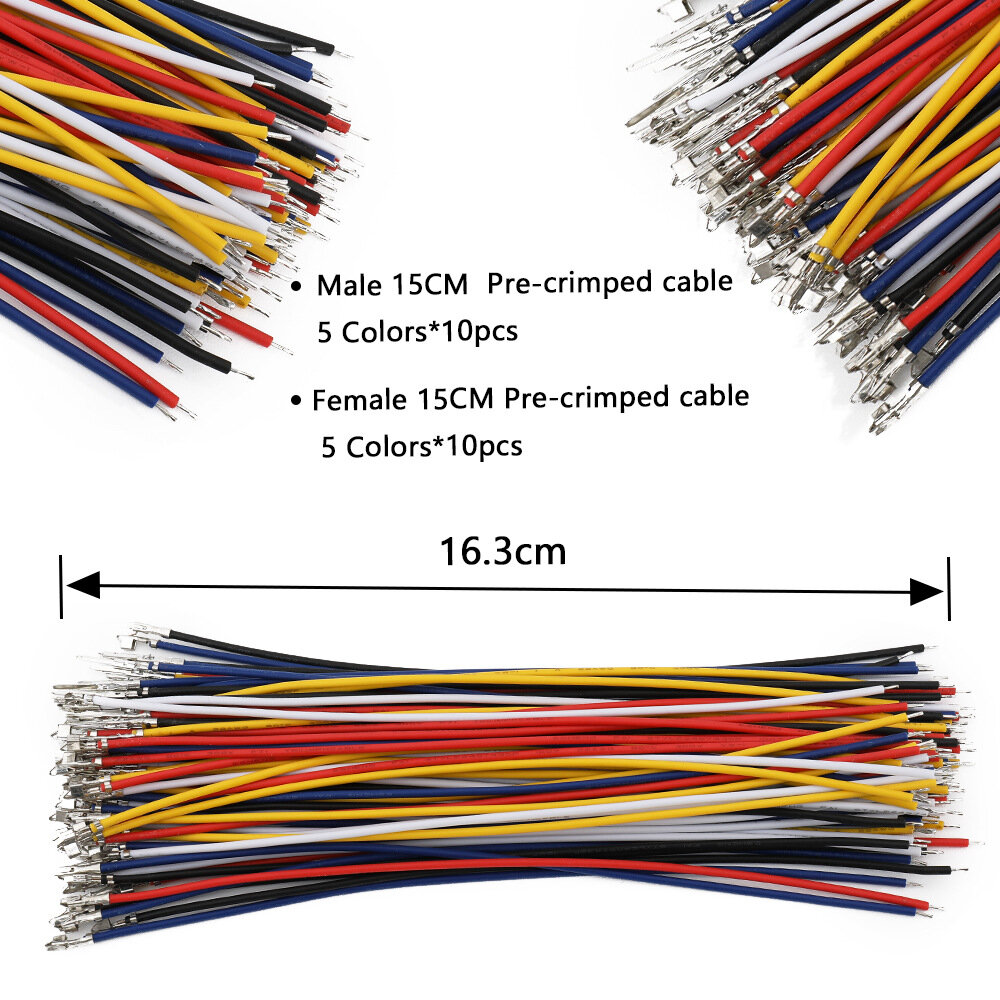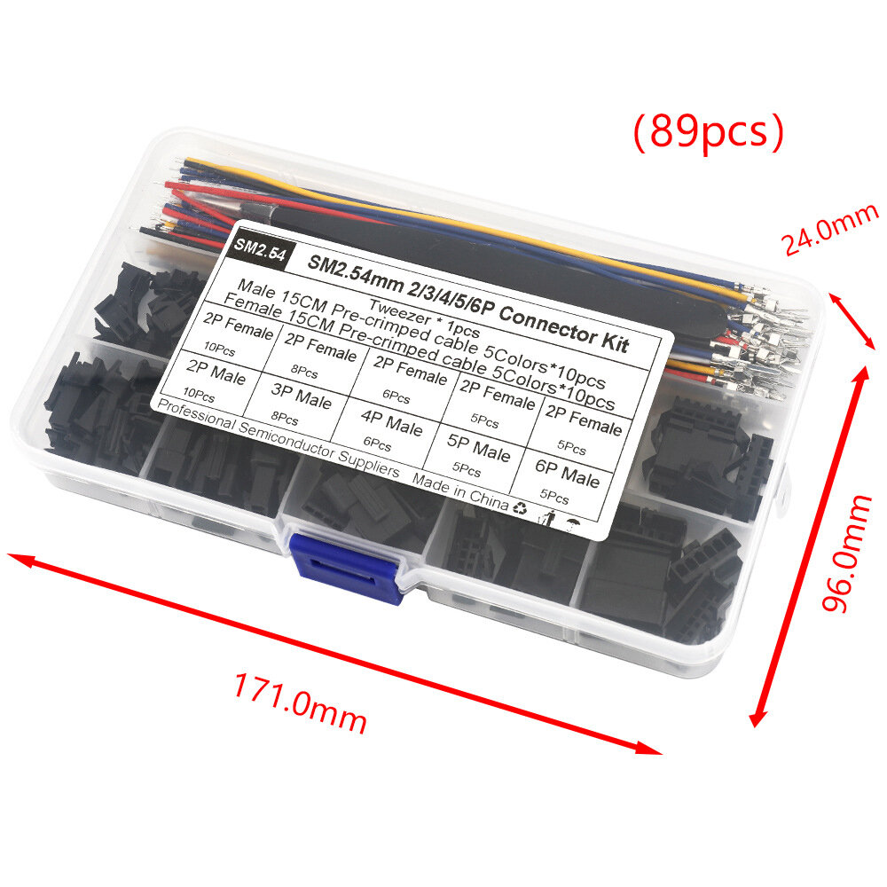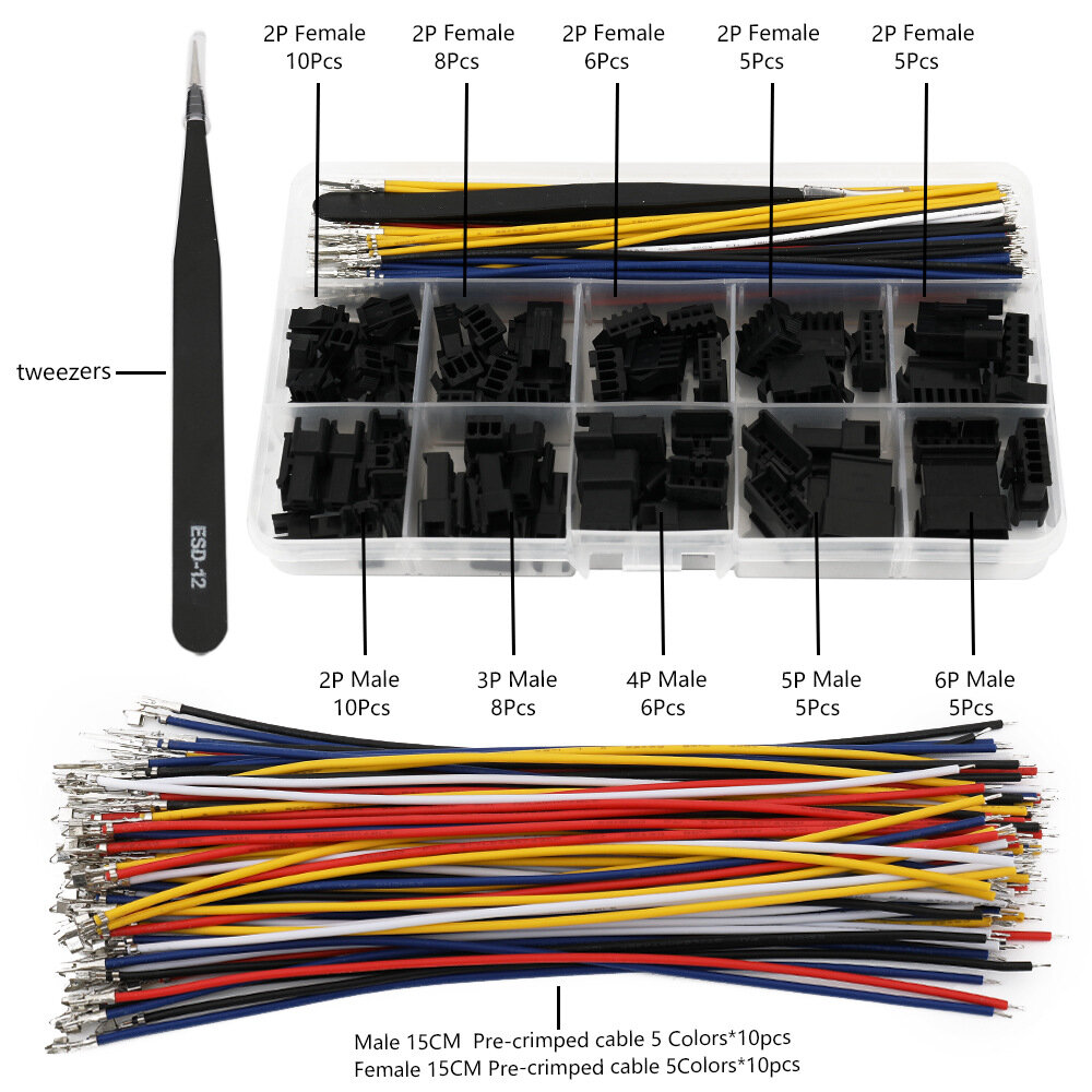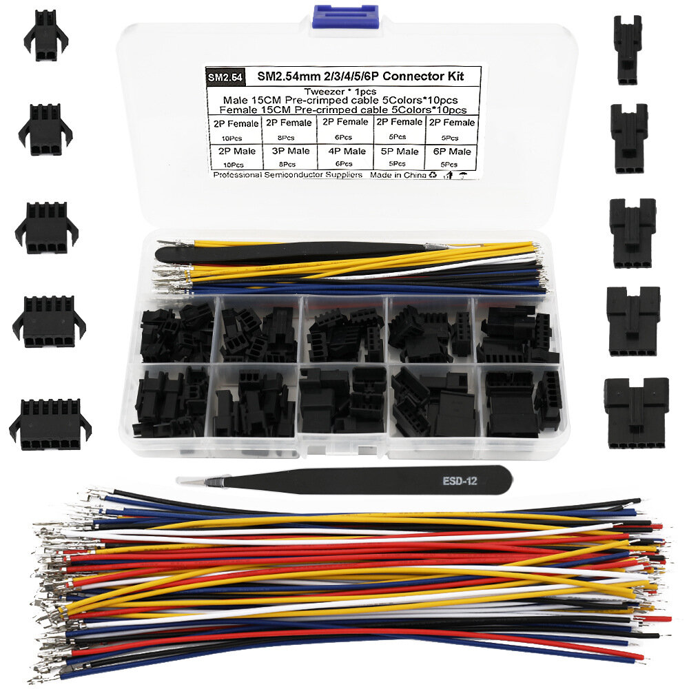 10 x SM2.54mm Male 2P Connector 8 x SM2.54mm Male 3P Connector 6 x SM2.54mm Male 4P Connector 5 x SM2.54mm Male 5P Connector 5 x SM2.54mm Male 6P Connector 10 x SM2.54mm Female 2P Connector 8 x SM2.54mm Female 3P Connector 6 x SM2.54mm Female 4P Connector 5 x SM2.54mm Female 5P Connector 5 x SM2.54mm Female 6P Connector 5 x Pre-crimped Red Cable (150mm, Male) 5 x Pre-crimped Black Cable (150mm, Male) 5 x Pre-crimped White Cable (150mm, Male) 5 x Pre-crimped Yellow Cable (150mm, Male) 5 x Pre-crimped Blue Cable (150mm, Male) 5 x Pre-crimped Red Cable (150mm, Female) 5 x Pre-crimped Black Cable (150mm, Female) 5 x Pre-crimped White Cable (150mm, Female) 5 x Pre-crimped Yellow Cable (150mm, Female) 5 x Pre-crimped Blue Cable (150mm, Female) 1 x Tweezers Tool 1 x Storage Box