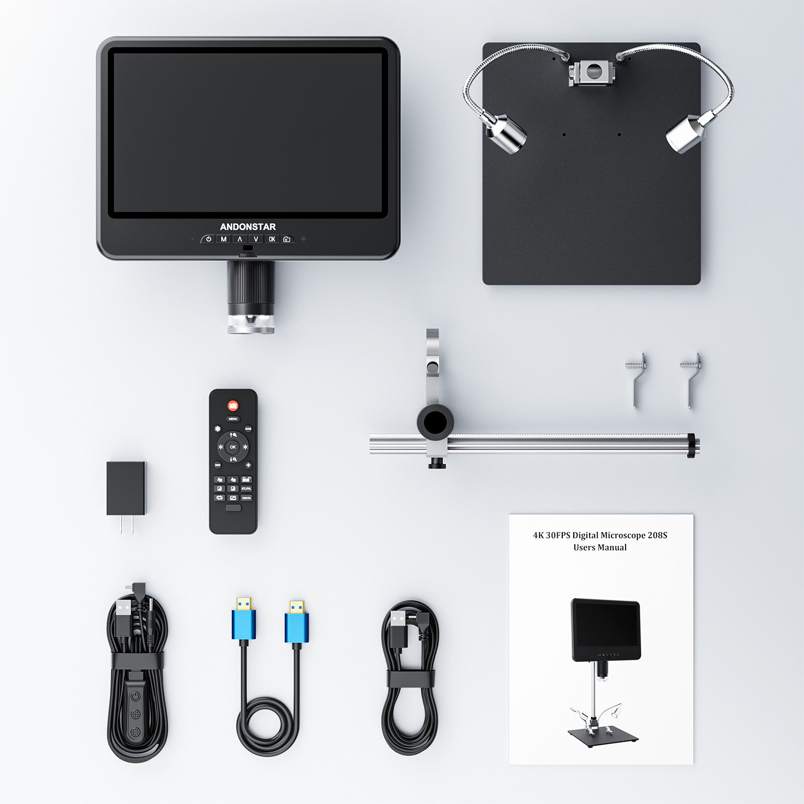 1 x Microscope 1 * Metal Base 1 x Column 1 x Power Adapter 1 x Power Cable 1 x USB Cable 1 x HDM Cable 1 x Remote Control 2 * Metal Clips 1 x User Manual
