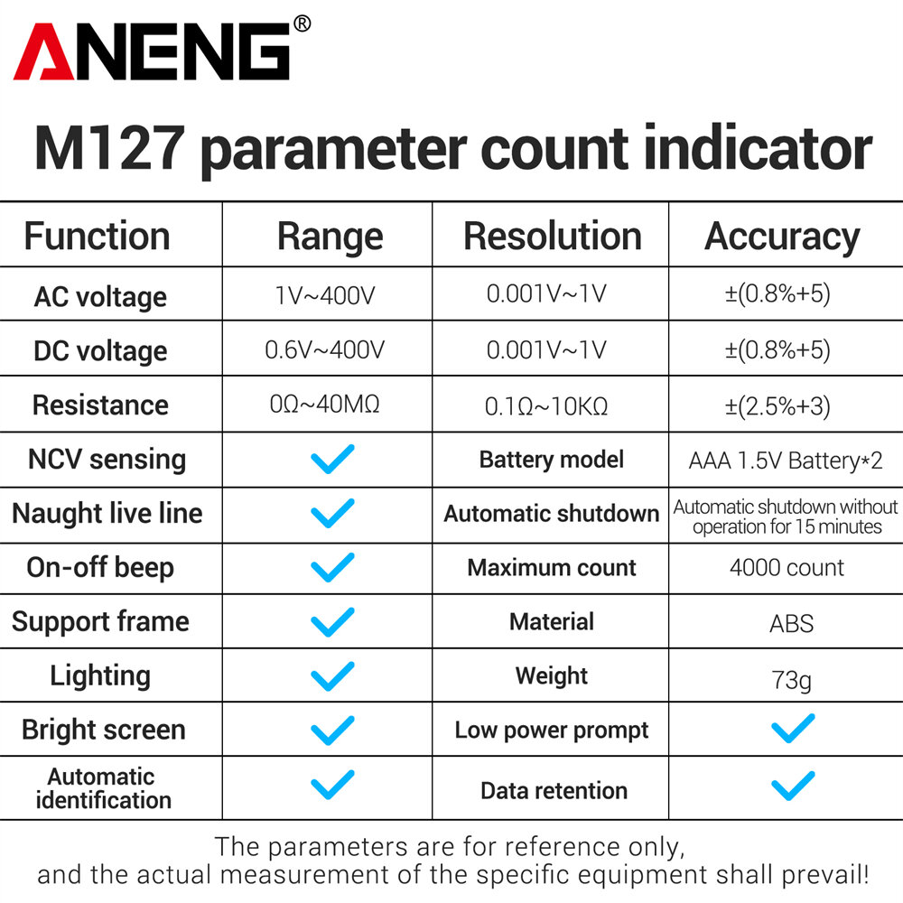 Accuracy: ±(0.8% +5) for voltage, ±(2.5% +3) for resistance