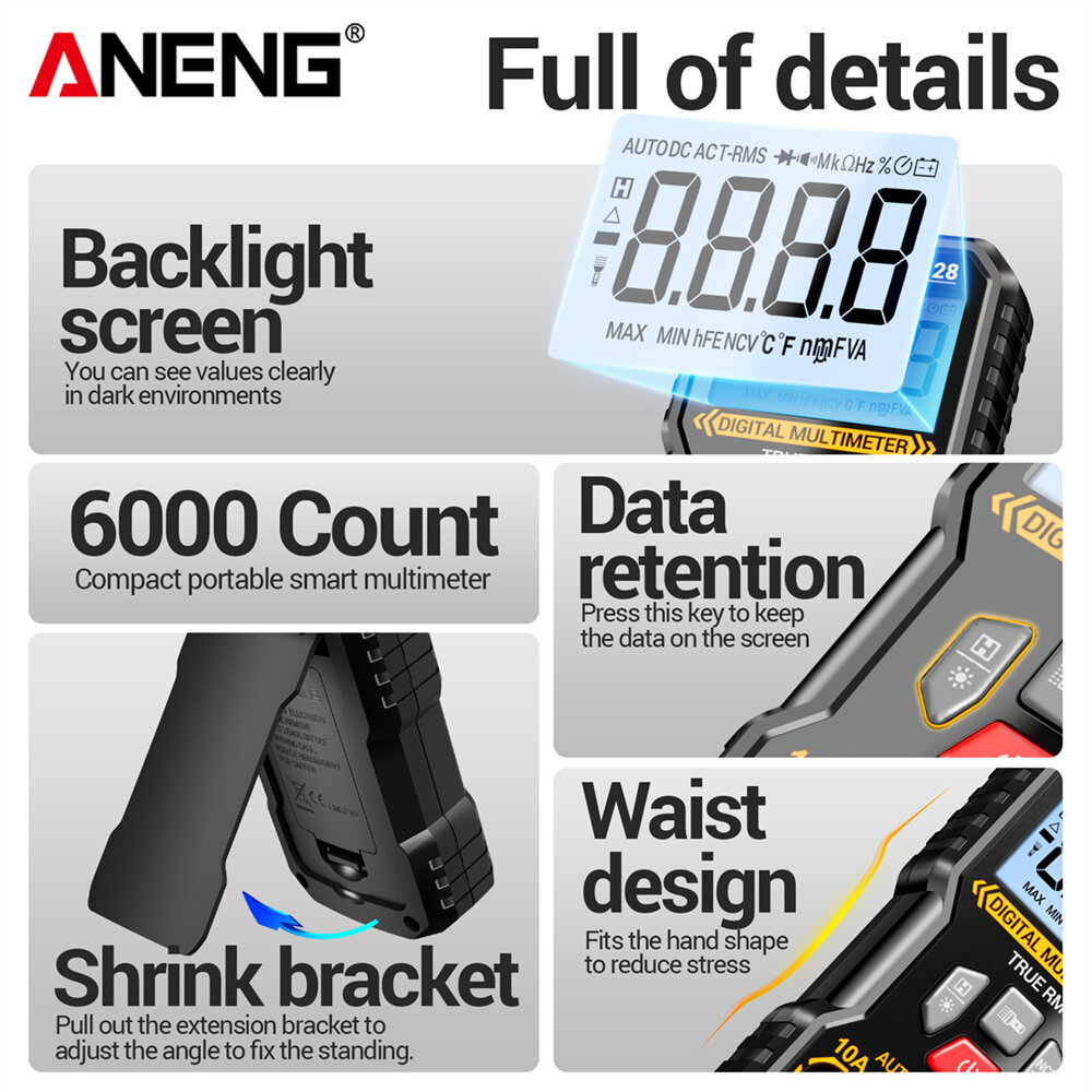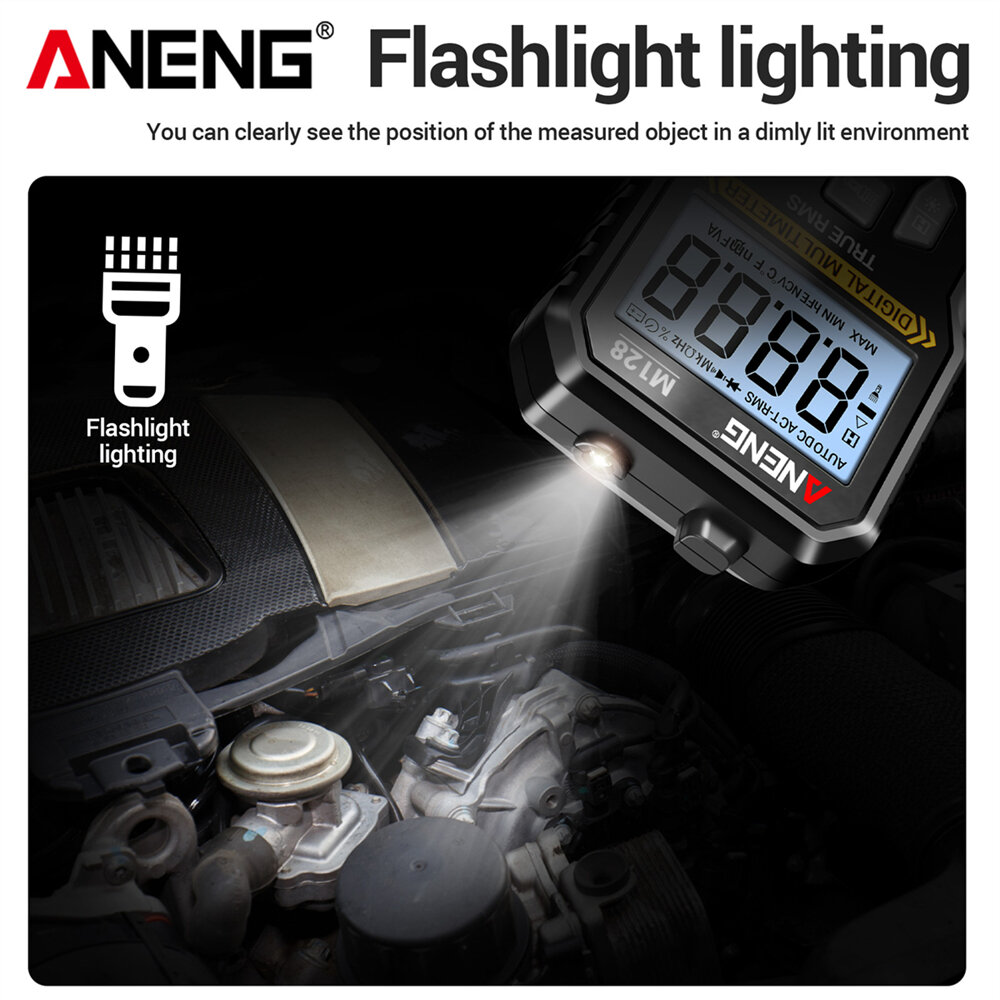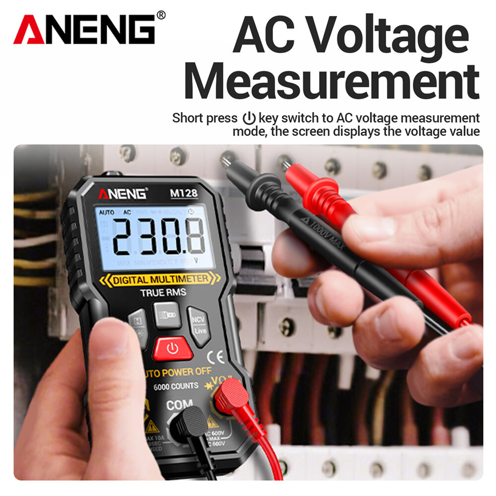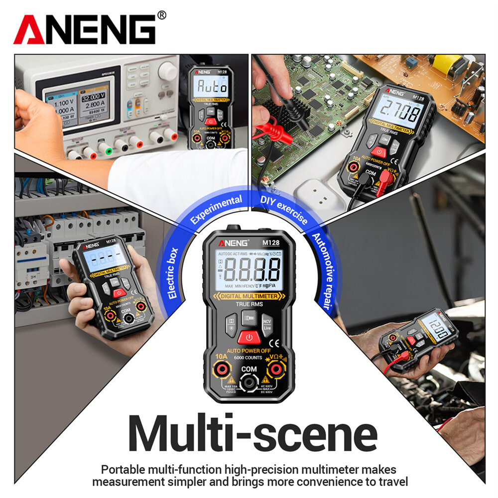 1. True RMS Measurement for Precision: With True RMS technology, the M128 enables accurate readings for both AC and DC signals, making it ideal for professional and personal use in complex circuits. 2. 6000-Count Display: The high-resolution 6000-count digital display ensures clear and precise measurement results, improving visibility and accuracy during operation. 3. Backlit LCD Screen: Equipped with a bright backlight, the screen allows easy reading in low-light environments, ensuring uninterrupted workflows even at night or in dim spaces. 4. Compact and Lightweight Design: Designed with portability in mind, the ANENG M128 is lightweight (79g) and has an ergonomic waist design that fits comfortably in your hand during longer tasks. 5. Automatic Range Detection: The auto-ranging function simplifies measurements by automatically determining the range required, so users can focus more on their work without manual adjustments.