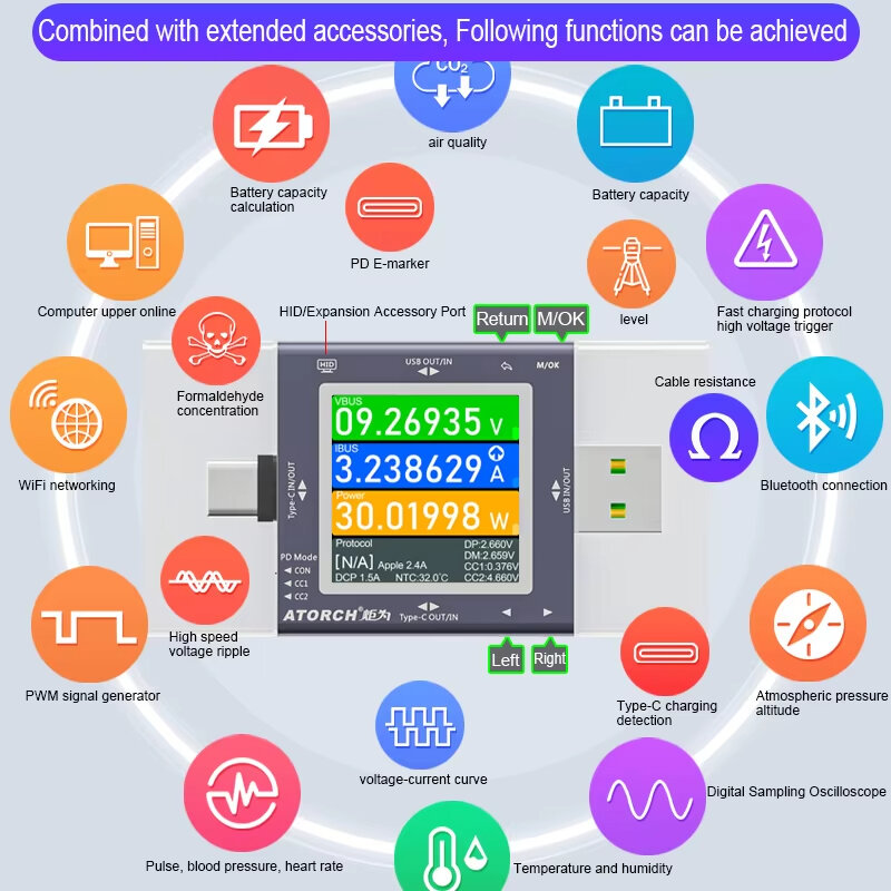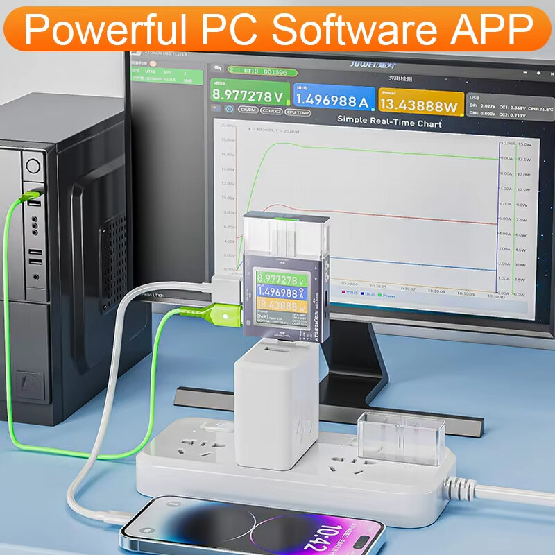1. Comprehensive Protocol Compatibility: Supports a wide range of high-voltage trigger and fast charging automatic scanning protocols, ensuring compatibility with major brands and diverse charging standards. 2. Precision Monitoring: Equipped with IPS high-definition full-view color screen for clear and accurate readings of voltage, current, and power in real-time. 3. Enhanced Charging Safety: Instant peak current measurement up to 12A provides precise analysis of charging stability and protects devices from potential overloads. 4. Portable and Efficient Design: Slim and lightweight Type-C USB tester, ideal for testing charging performance on-the-go with scalable features for extended usability. 5. High Performance for Power Delivery: Built to support PD3.0 and PD2.0 protocols, ensuring fast charging and optimized power management for modern devices.