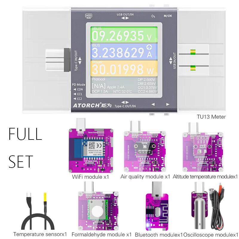 Full Set: 1 x TU13 Tester 1 x Computer Networking Cable 1 x WiFi Communication Module 1 x Air Quality Module 1 x Altitude Temperature Module 1 x Type-C External Temperature Sensor 1 x Formaldehyde Module 1 x Bluetooth Communication Module 1 x Oscilloscope Module