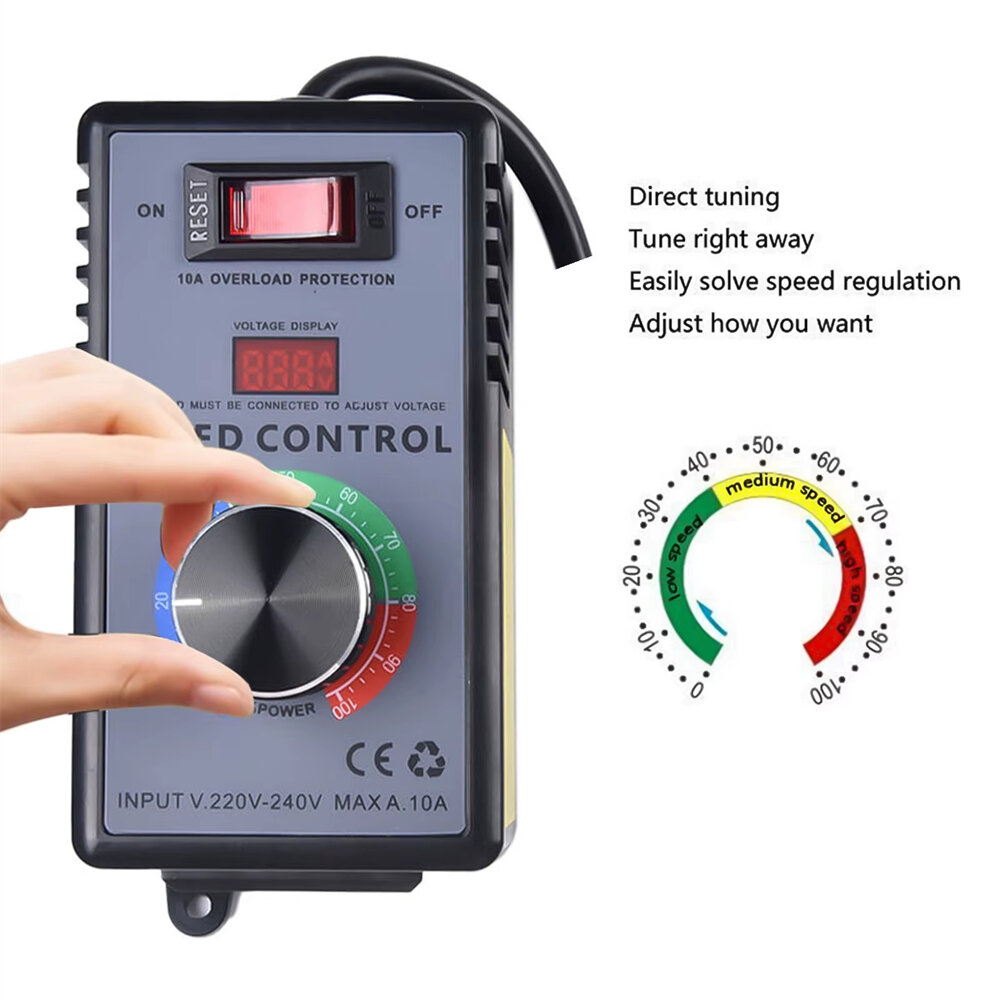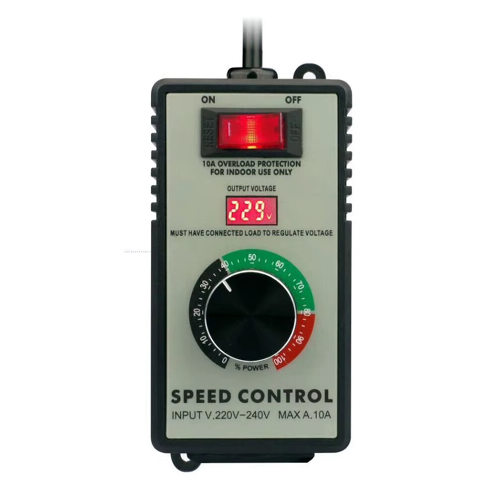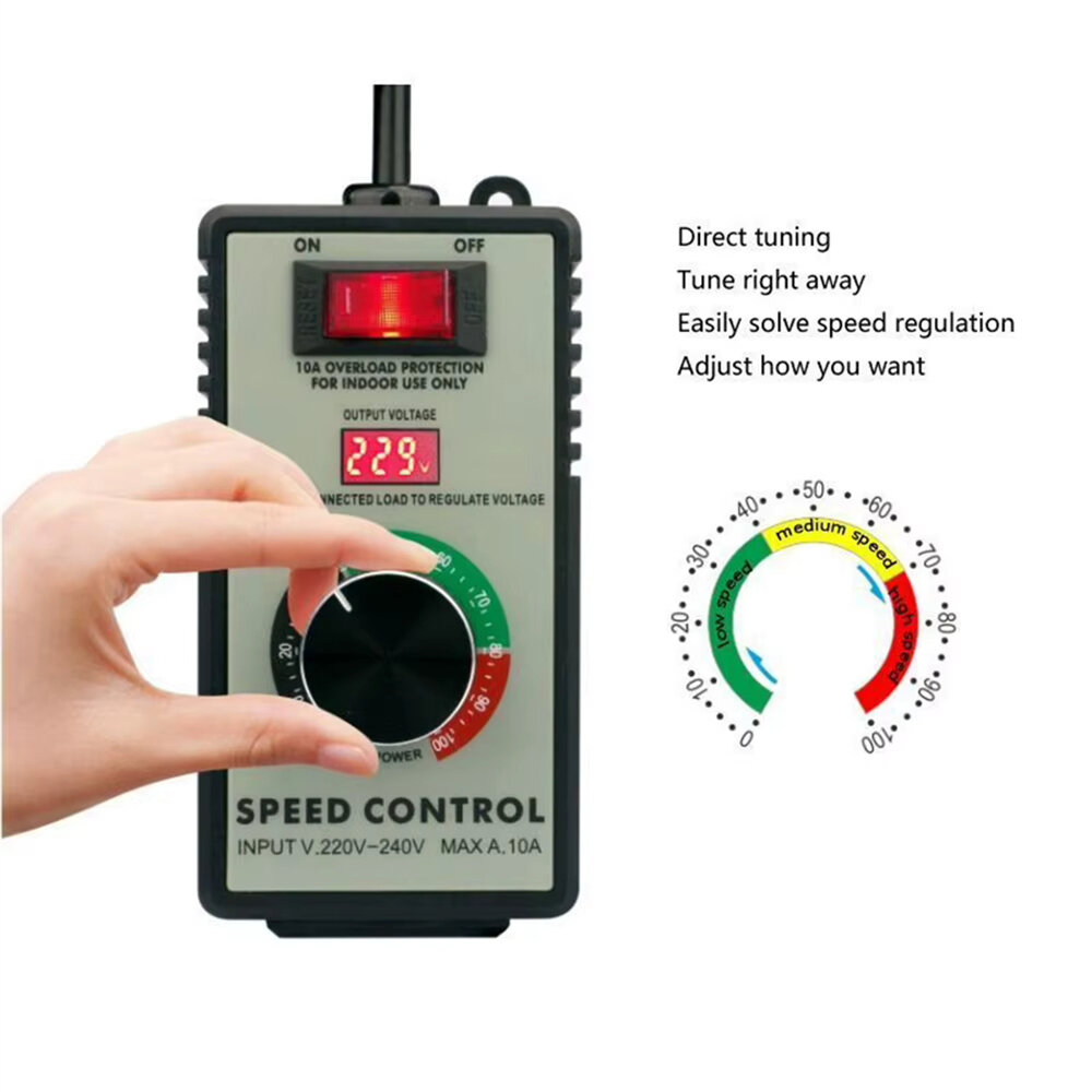 1.Wide Compatibility: Supports speed adjustment for fans, brushed motors, and tools without speed gears. Can also adjust temperature on electric stoves, heating rods, and similar appliances. Does not support devices with circuit board or advanced electronics. 2.Precision Control: Incorporates a voltage adjustment knob with LED digital display for real-time monitoring. Offers high accuracy with control precision reaching 1 volt. 3.Robust Craftsmanship: Designed with a flame-retardant, insulated ABS plastic casing that resists deformation under high temperatures. Thickened phosphor bronze interior enhances product reliability over time. 4.Safety Features: Built-in overload and short circuit protection automatically cuts off power when current exceeds 15 amps to Protect both the controller and connected devices. 5.Portability and Convenience: Includes a rear hook for easy hanging on tool bags. Plug-and-play functionality simplifies operation for user-friendly control in various scenarios.