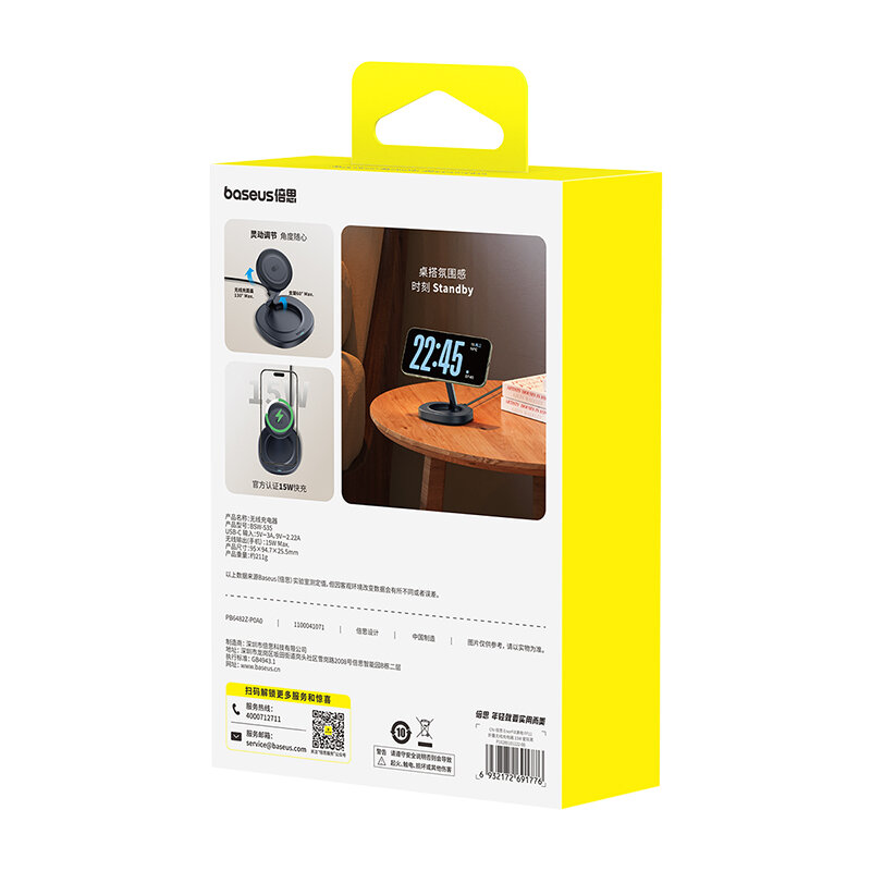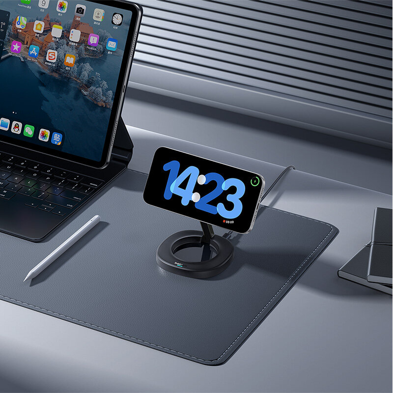 1. 15W Wireless Fast Charging: Certified by WPC for rapid and efficient power delivery, suitable for a variety of devices. 2. Magnetic Stability: Equipped with 16 powerful magnets for secure and uninterrupted charging even through cases up to 5mm thick. 3. Foldable Design: Space-saving structure offers portability, making it perfect for home, office, and travel. 4. Dual-Axis Adjustability: 130°+60° adjustable angles ensure ergonomic viewing and optimal charging positions. 5. Efficient Heat Dissipation: Split design enhances heat management, enabling safe operation during extended use.