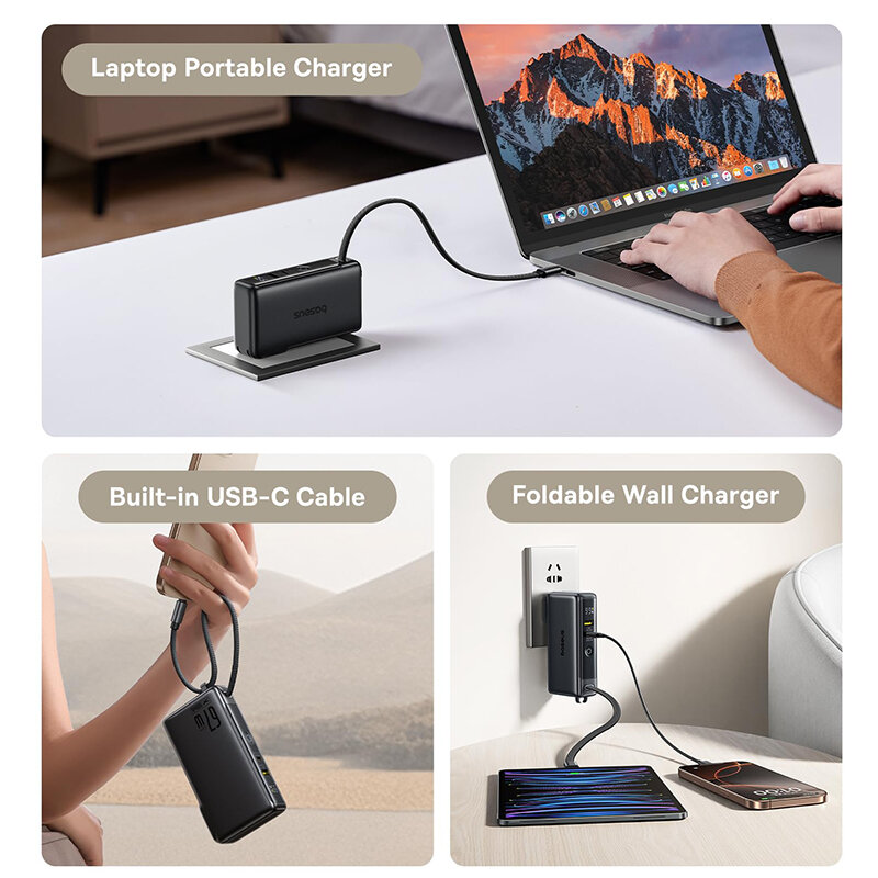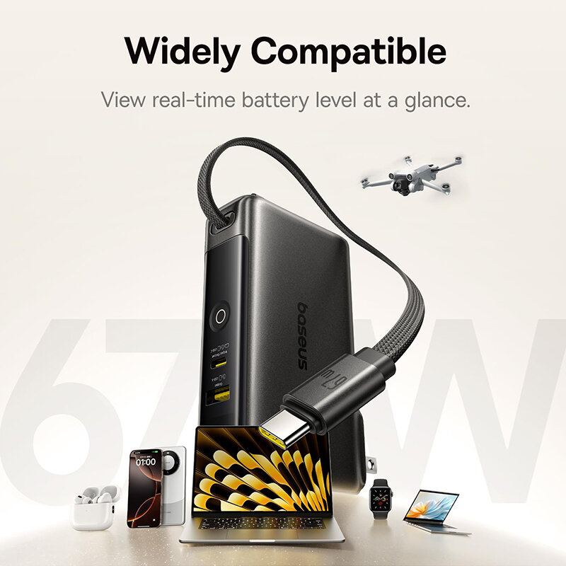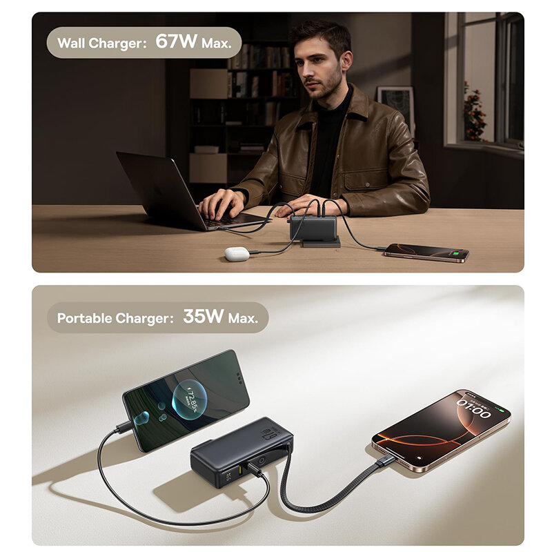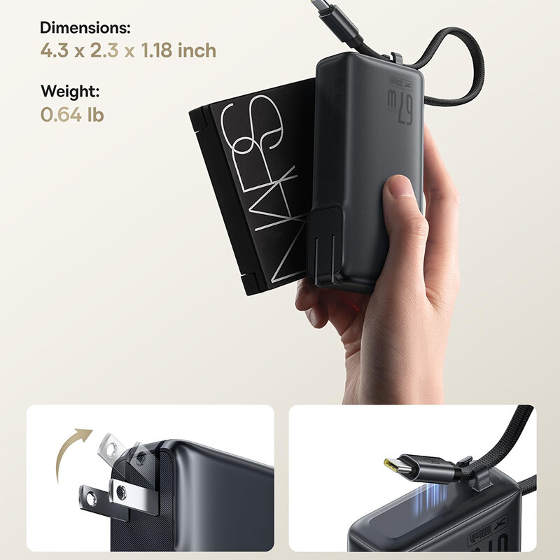 1.u30103-in-1 Power Solutionu3011Power Bank & Wall Charger & Built-in USB-C Cable. Simplify your charging setup with this all-in-one power station! No more carrying separate power banks, chargers, or cablesu2014just grab this compact 3-in-1 powerhouses for seamless charging on the go. 2.u301067W Ultra-Fast Charging (Adapter Mode)u3011As a wall charger, it delivers blazing-fast 67W output to quickly juice up your laptop, phone, or tablet. Even smarter: it supports pass-through charging, so you can recharge the power bank itself while simultaneously charging your devices. 3.u301010,000mAh Power Bank with 35W High-Speed Chargingu3011In portable charger mode, the 10,000mAh battery provides 2 full charges for an for iPhone 16, with 35W fast charging that refuels your for iPhone 16 to 60% in just 30 minutes. Perfect for emergencies or busy days! 4.u3010Triple-Device Charging with 60W Total Outputu3011Power up 3 devices at once via the USB-C port (PD), USB-A port, and built-in USB-C cable. With a combined 60W output in adapter mode, it effortlessly handles your tech-heavy workflowu2014ideal for professionals and travelers. 5.u3010Travel-Ready & Ultra-Portableu3011Designed for life on the move! The foldable plug and compact size slip easily into pockets or bags. Whether commuting or globetrotting, stay powered without the bulk.