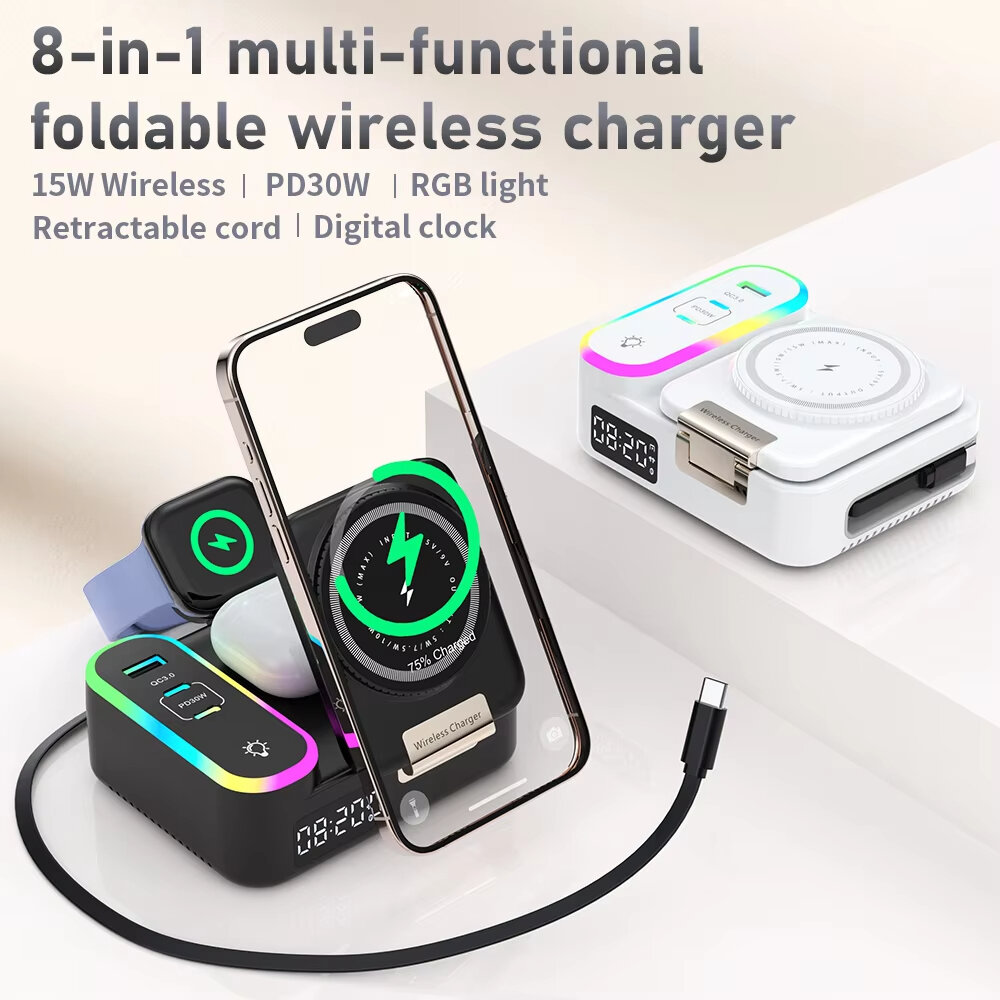 1. 8-in-1 Functionality: Combines a wireless charger (15W), retractable Type-C cable, RGB lighting effects, foldable phone stand, and digital clock for enhanced convenience and multi-device charging. 2. Charging Capability for Multiple Devices: Simultaneously charges up to six devices, including smartphones, headphones, smartwatches, and small gadgets via USB ports and wireless pads. 3. Fast Charging Technology: Advanced PD30W and QC3.0 ports ensure rapid charging and reliable performance for high-powered devices. 4. Magnetic and Adjustable Stand: Strong magnetic coil ensures secure phone positioning, allowing horizontal and vertical charging with folded angle adjustments. 5. Dynamic RGB Light: A touch-enabled RGB lighting system adds style and visibility, making the station suitable for any modern setup. 6. Comprehensive Protection System: Includes overcurrent, overvoltage, short-circuit, overheating, and flame-retardant safeguards for worry-free usage.