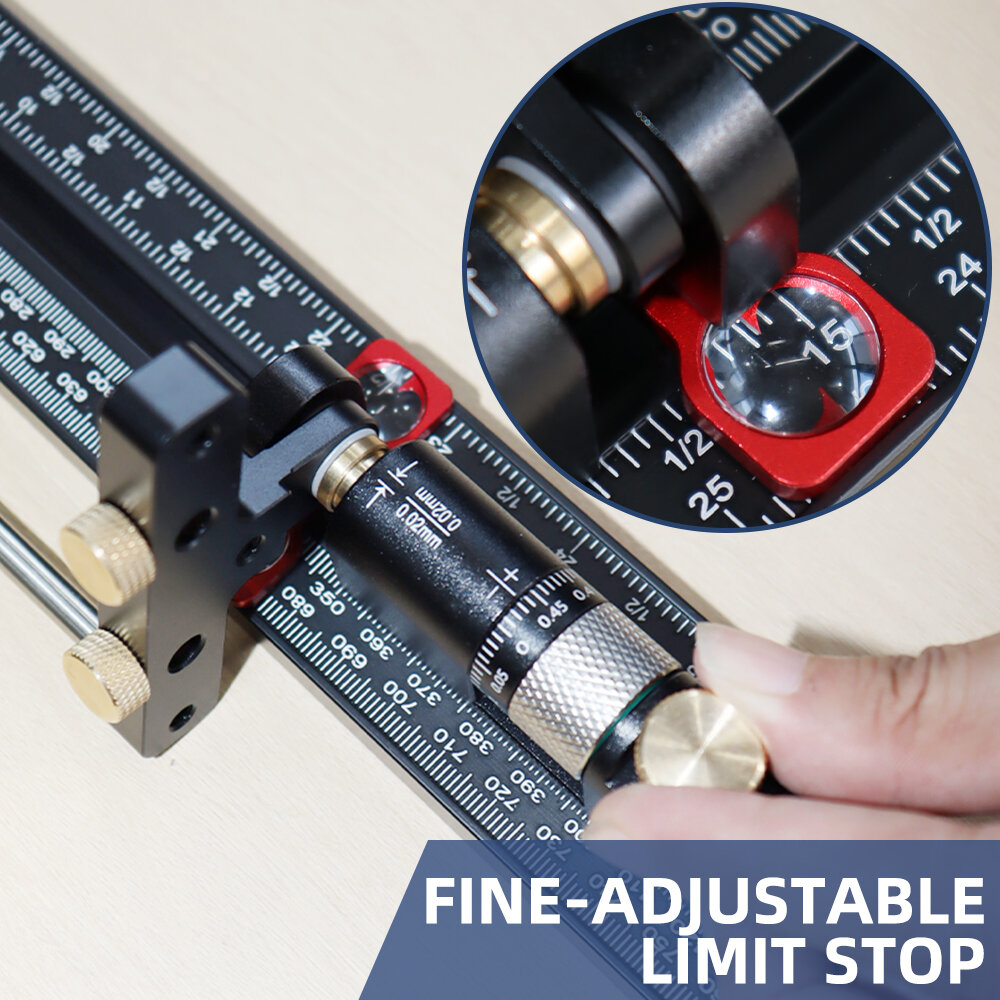 The flip stop with fine adjustment capability allows precise calibration, ensuring exact repeatable cuts every time. Perfect for professional-grade woodworking projects.