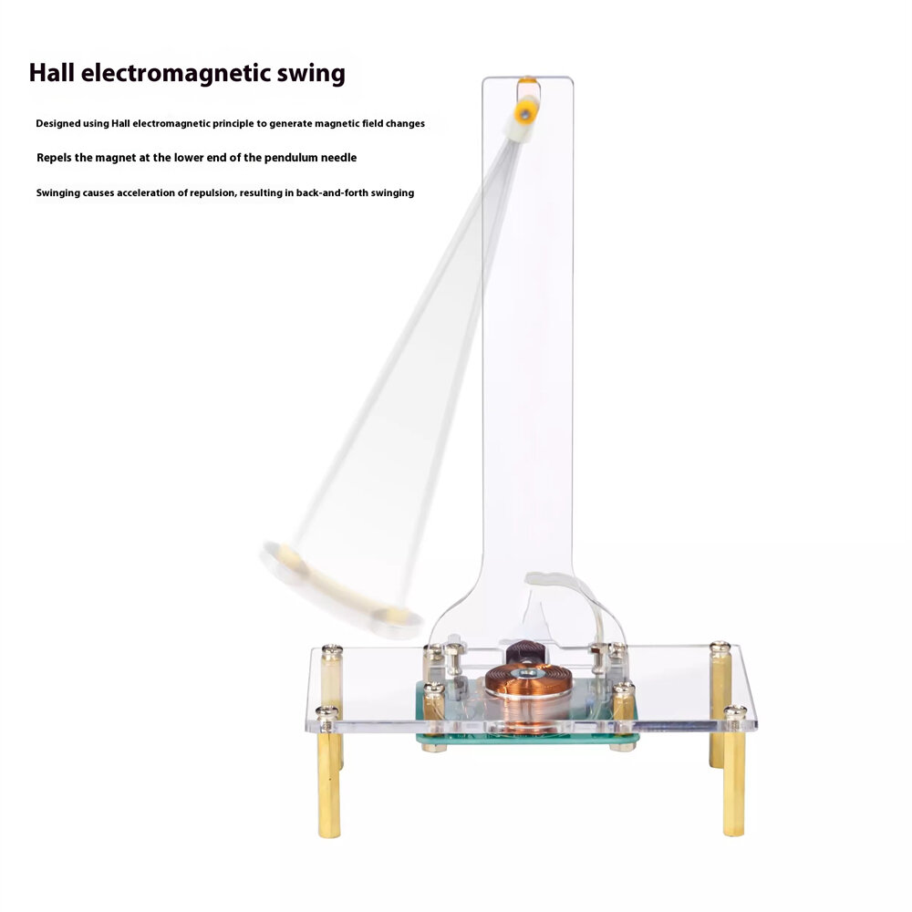 The product utilizes a Hall sensor to detect the magnetic field and generate a feedback loop that powers the electromagnetic swing for continuous motion.