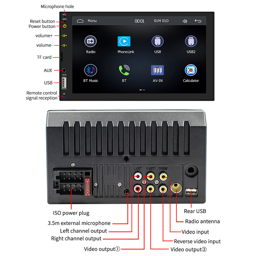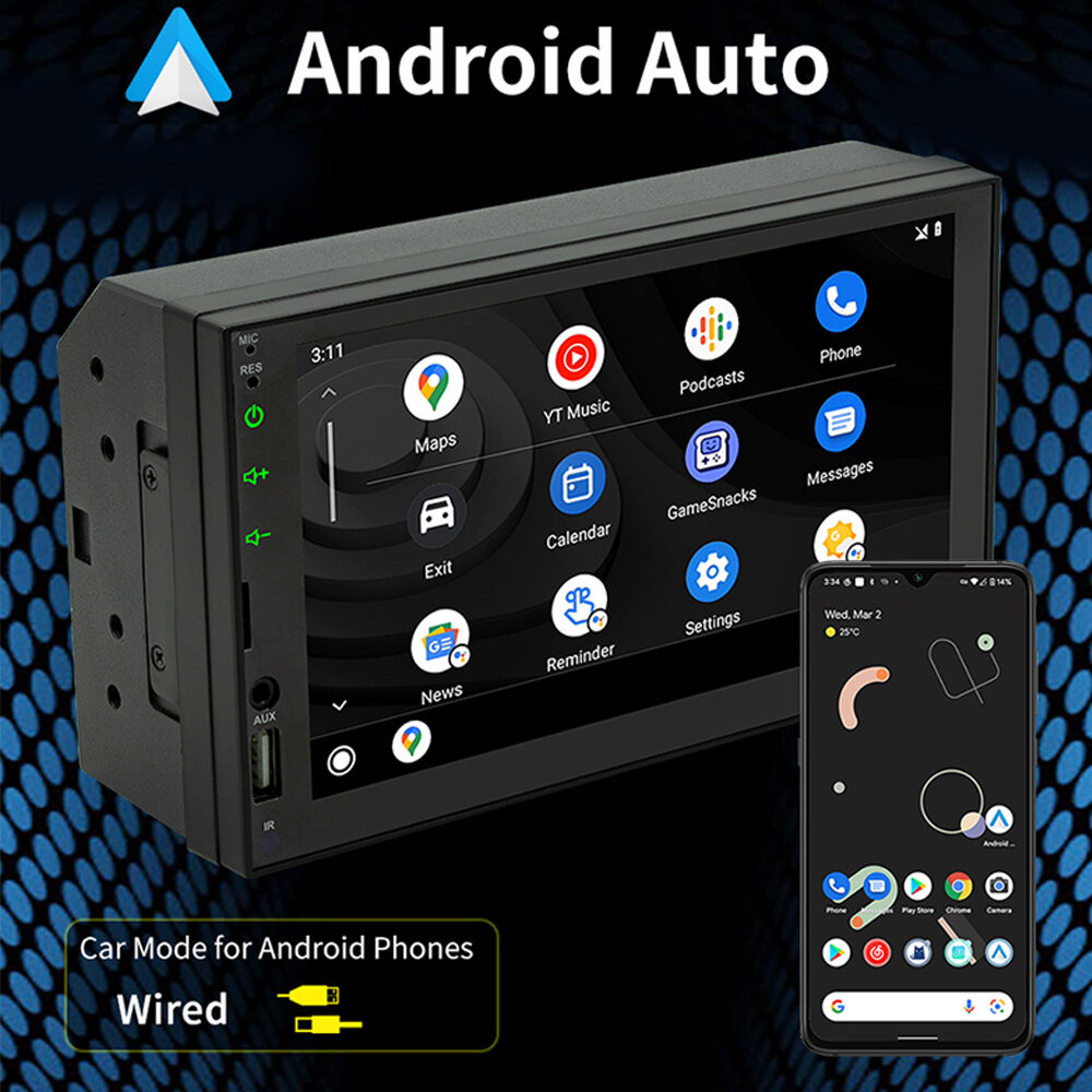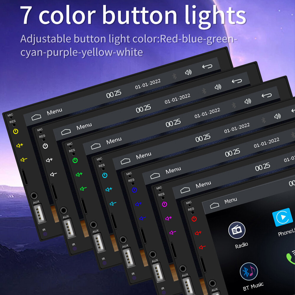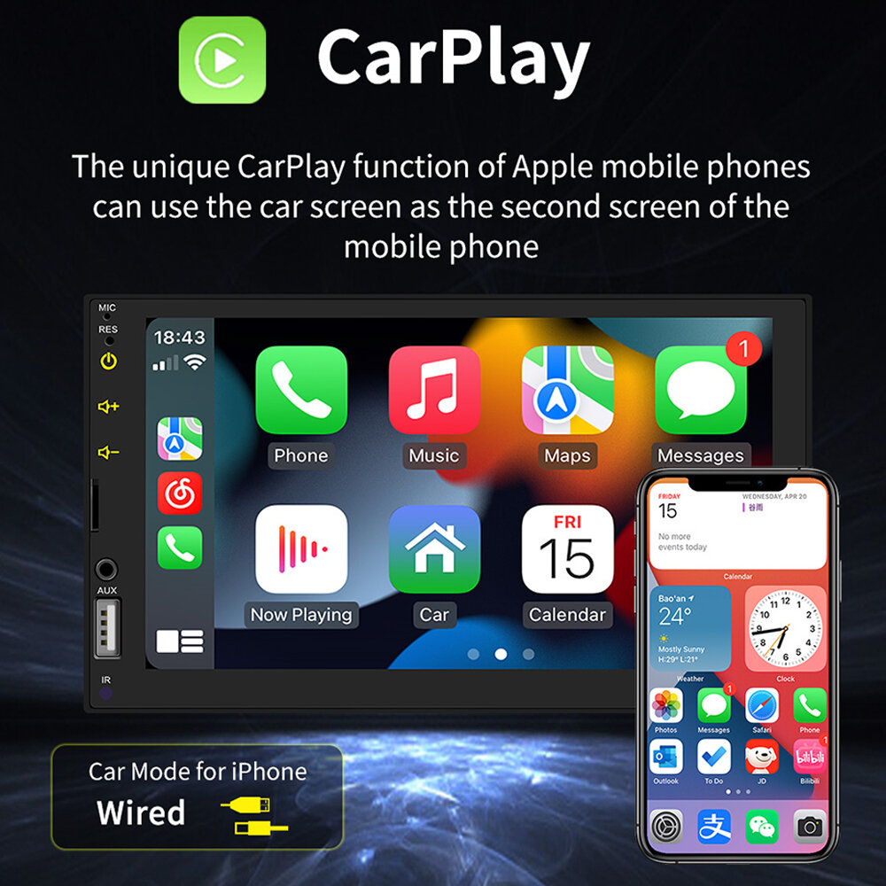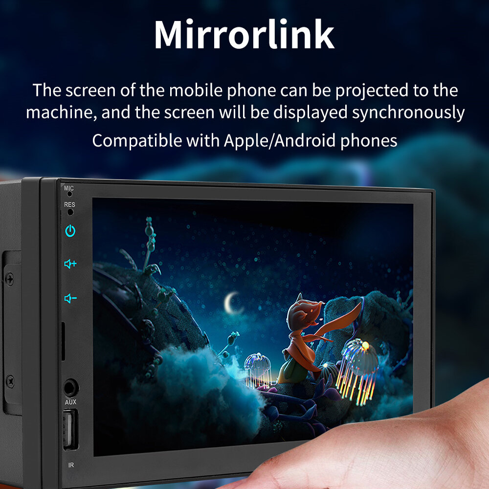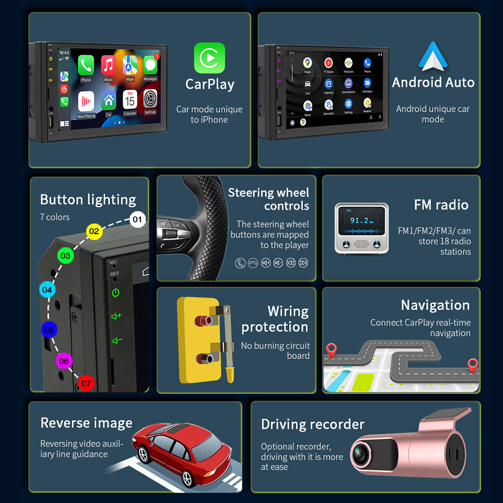 Feature: - Apple CarPlay Integration: Seamlessly connect your iP for navigation, calls, and music directly on the 7-inch screen. - Android Auto Support: Enjoy hands-free control with Android-specific apps, including real-time navigation and voice commands. - MirrorLink Compatibility: Project your smartphone screen onto the car player for enhanced visibility and functionality. - Colorful Button Lighting: Adjustable 7-color button lights for customizing aesthetics to match your vehicle's interior. - Steering Wheel Controls: Map functions like volume, calls, and music to steering wheel controls for a safer driving experience. - Real-Time GPS Navigation: Provides accurate routing through connected smartphone navigation apps. - Multimedia Playback: Plays MP3/FLAC video and audio files for enhanced entertainment on the go. - FM Radio: Built-in tuner supports multiple regions and stores up to 18 radio stations. - Reverse Camera Display: Supports optional rear camera for improved safety during reversing.