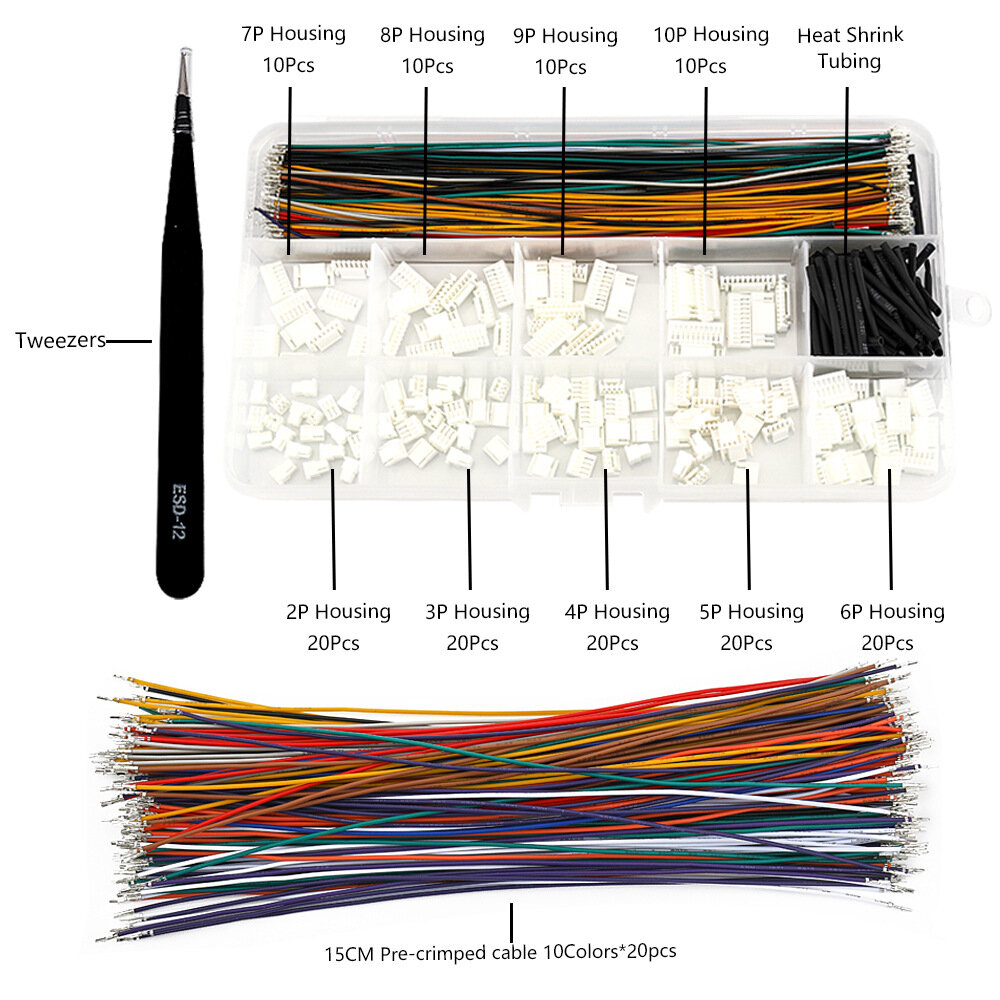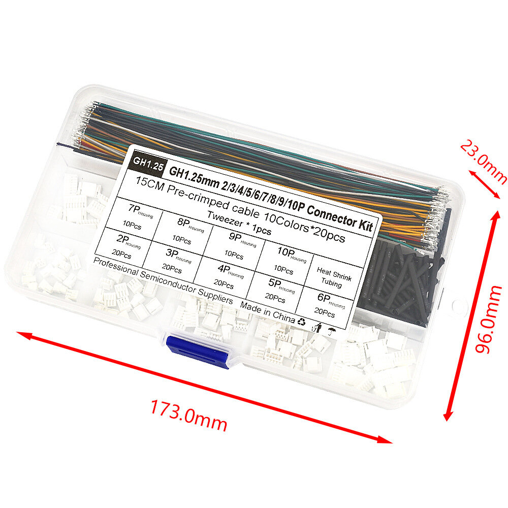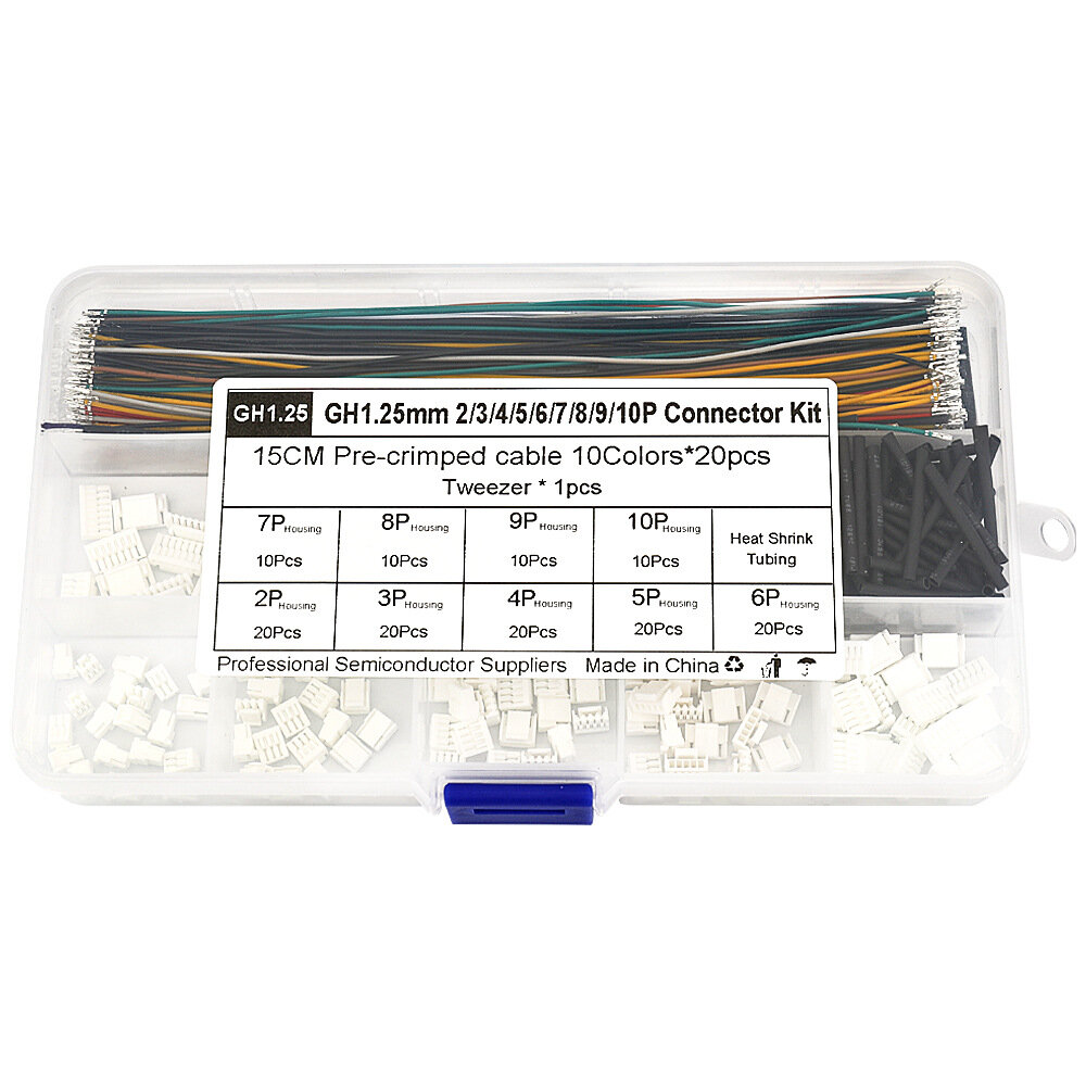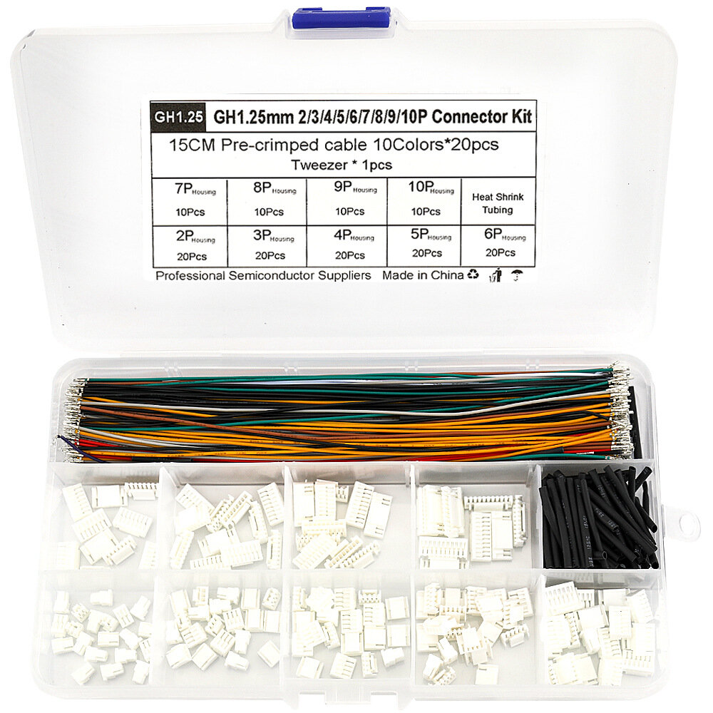 20 x GH1.25-2Y locking housings 20 x GH1.25-3Y locking housings 20 x GH1.25-4Y locking housings 20 x GH1.25-5Y locking housings 20 x GH1.25-6Y locking housings 10 x GH1.25-7Y locking housings 10 x GH1.25-8Y locking housings 10 x GH1.25-9Y locking housings 10 x GH1.25-10Y locking housings 200 x 28AWG dual-head cables (10 colors, 20 pieces per color) 100 x Heat shrink tubing 1 x Tweezers