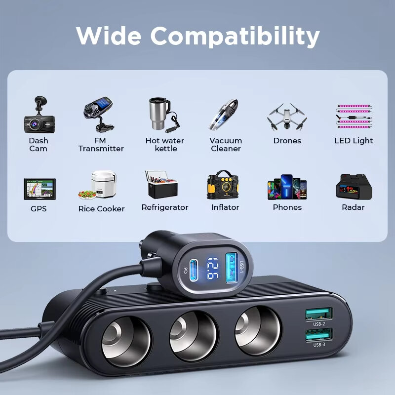 Brand: Joyroom Model: JR-CCL01 Product Name: 7-in-1 CigaretteLighter Adapter Color: Black Total Power Output: 179W CigaretteLighter Ports: 3 sockets USB Ports: 3 USB-A + 1 USB-C Protocol Supported: PD&QC3.0 Input Voltage Compatibility: Supports 12V and 24V vehicles Safety Features: 8 types of protection including over-voltage, over-current, fire resistance, and short-circuit protection LED Display: Real-time voltage monitoring for 12V (11.5V-14.9V) and 24V (23.1V-27.3V) range
