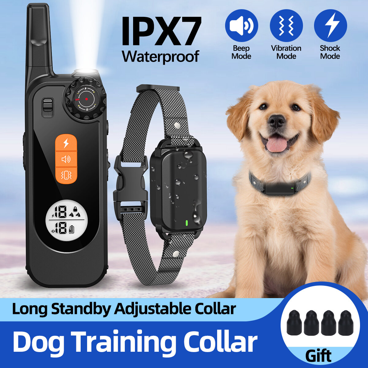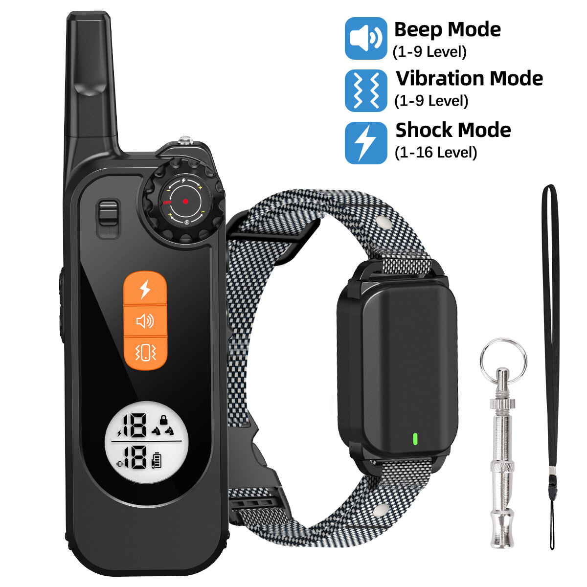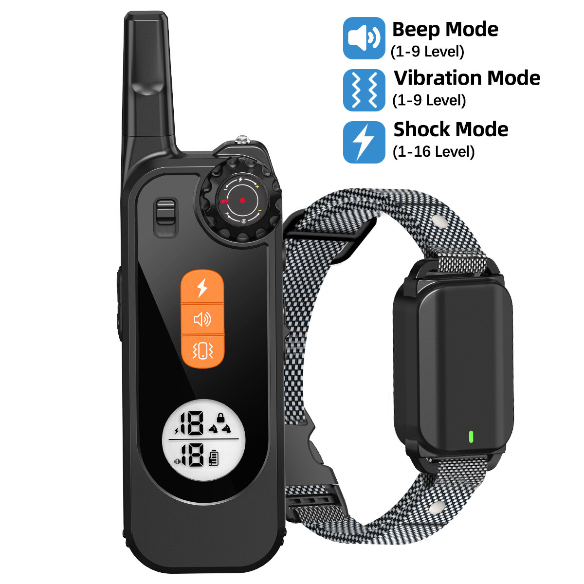 Training Modes: 3 modes and 1 light mode featuring beep (1-9 levels), vibration (1-9 levels), shock (1-16 levels), and a night light.
