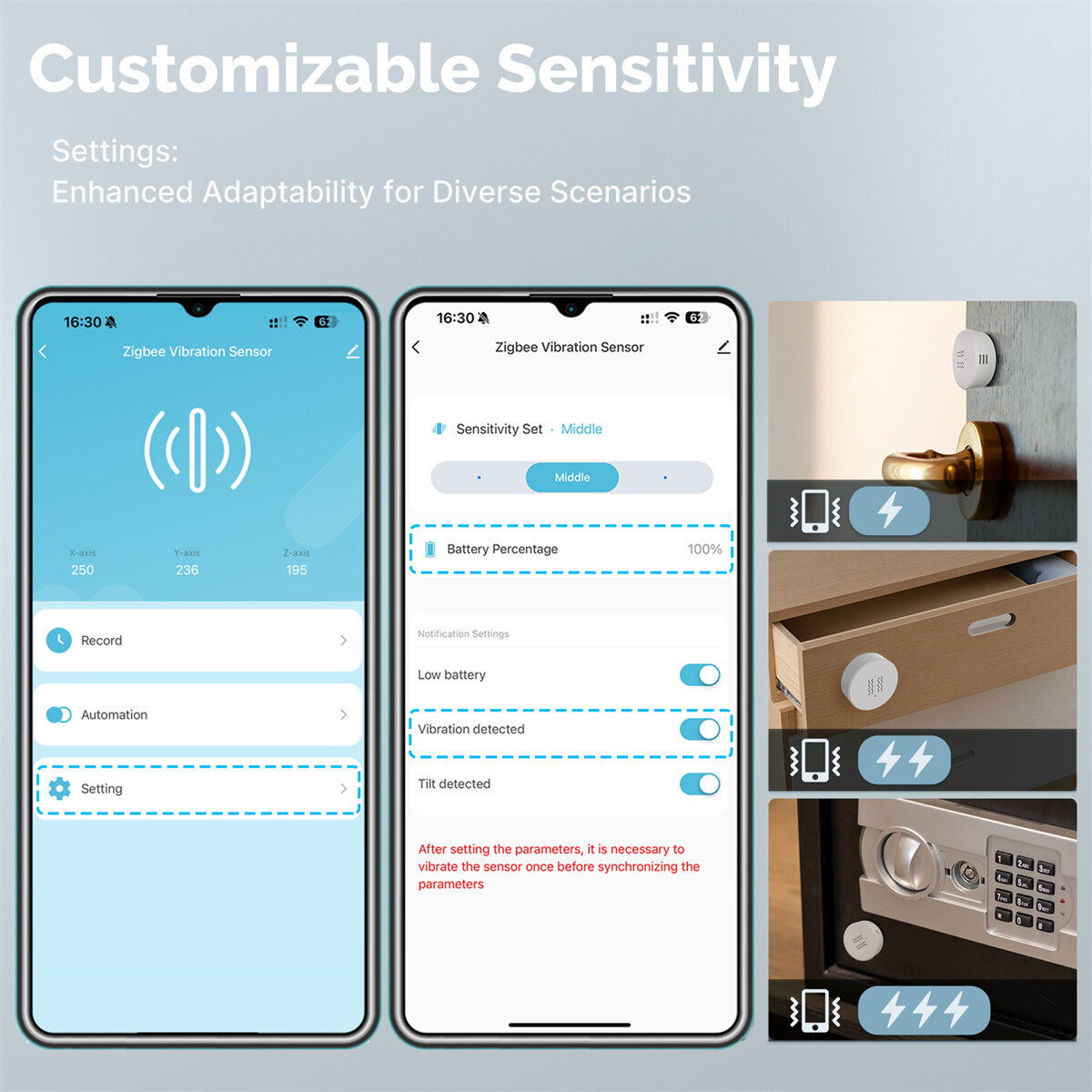 3. Remote Alerts via App: Provides real-time push notifications for vibration or tilt activity, enhancing home monitoring.