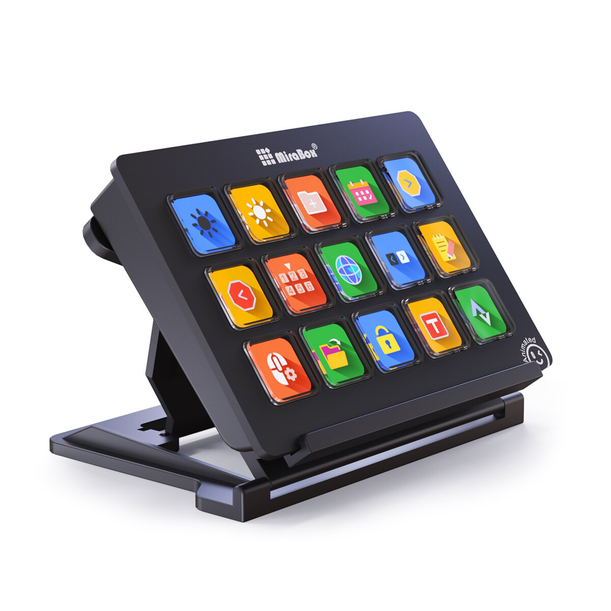 1. Customizable LCD Keys: 15 programmable keys with drag-and-drop functionality to suit personal workflows and tasks. 2. Trigger Chain Actions: Assign multiple actions to a single key for streamlined operations, including switching scenes and launching media. 3. Powerful Integrations: Seamlessly integrates with popular tools such as OBS, Streamlabs, YouTube, Twitch, Spotify, and more. 4. Advanced Software: User-friendly interface allowing key personalization with custom icons and animated GIFs. 5. Studio-Level Control: Tap to manage scenes, control audio, and operate multimedia tools with precision. 6. Compact and Adjustable Design: Ideal for professional setups, with an adjustable stand to optimize angles for usage.