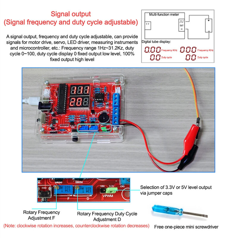 Includes a signal generator with adjustable frequency and duty cycle to aid in component testing and waveform generation.
