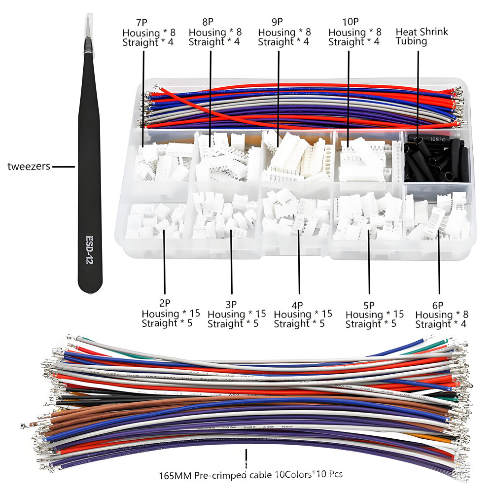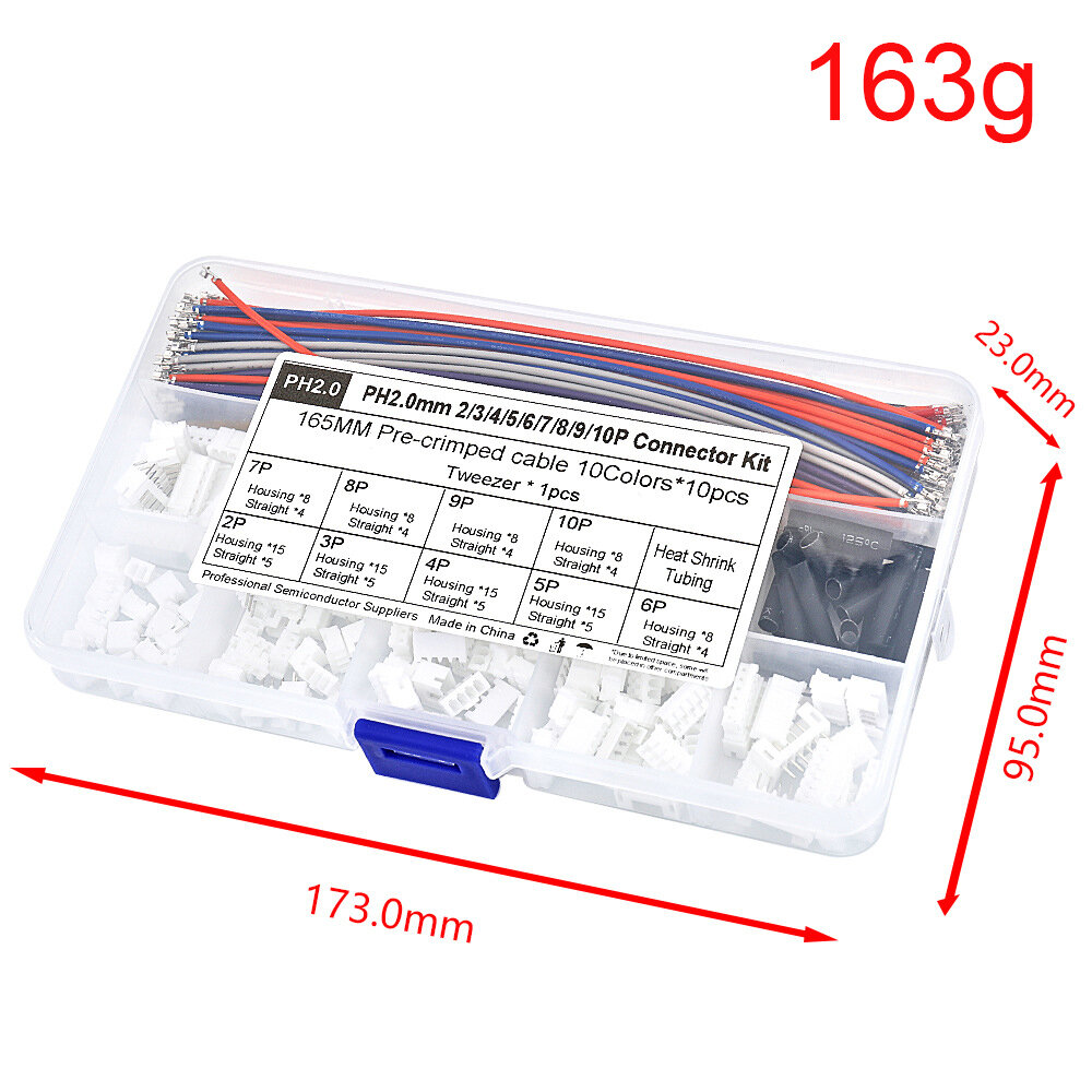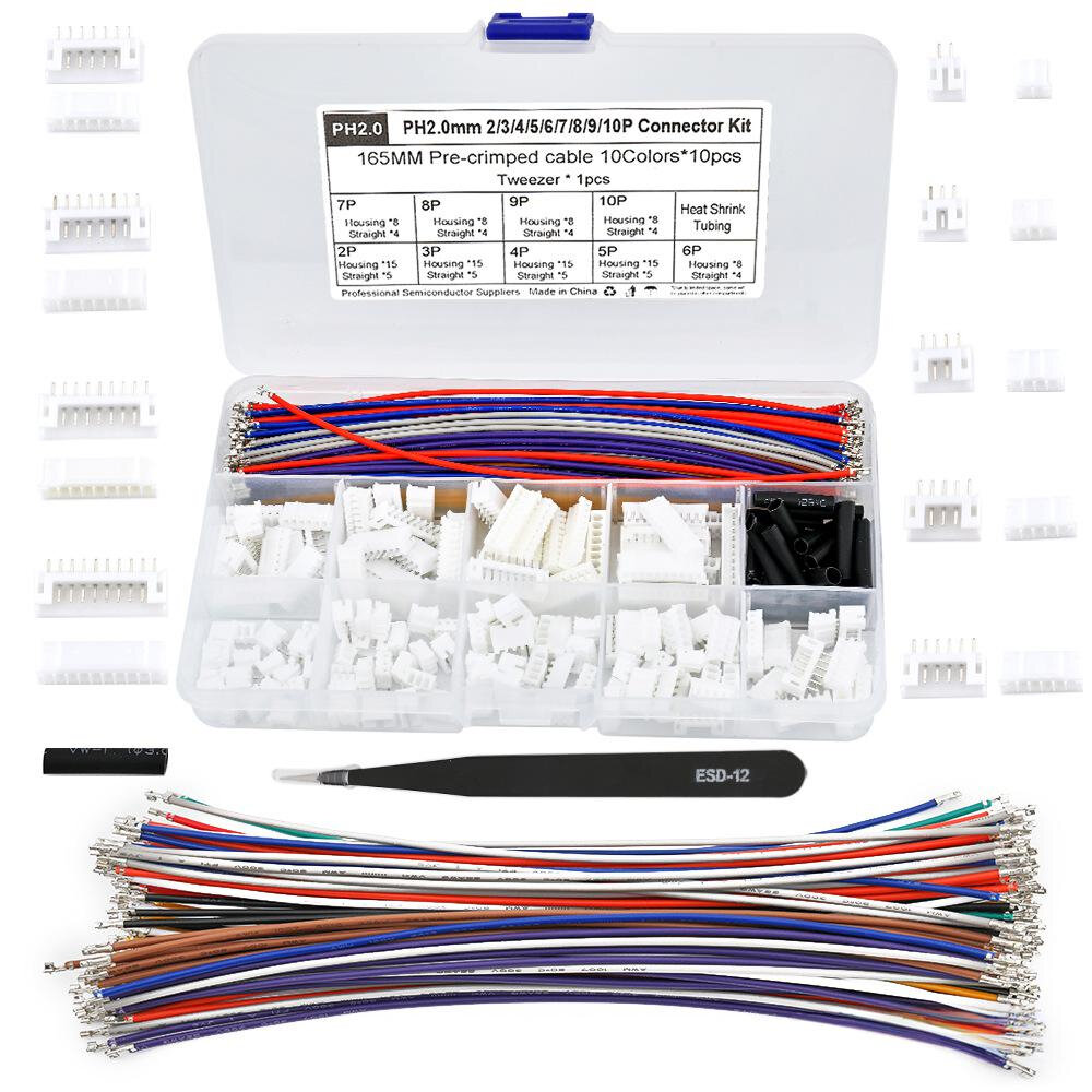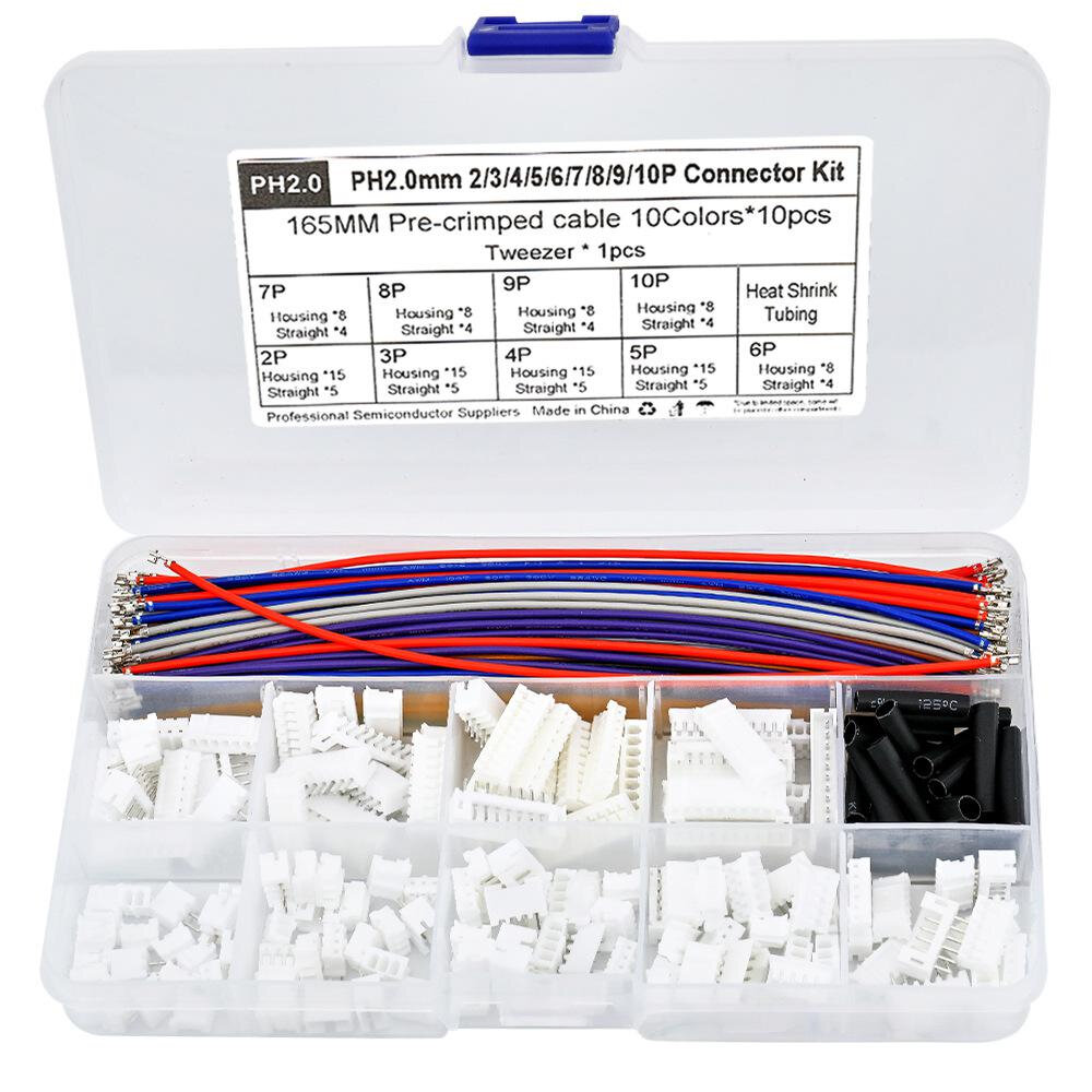 15 x PH2.0 2P Straight Pin Header 15 x PH2.0 3P Straight Pin Header 15 x PH2.0 4P Straight Pin Header 15 x PH2.0 5P Straight Pin Header 8 x PH2.0 6P Straight Pin Header 8 x PH2.0 7P Straight Pin Header 8 x PH2.0 8P Straight Pin Header 8 x PH2.0 9P Straight Pin Header 8 x PH2.0 10P Straight Pin Header 5 x PH2.0 2P Housing 5 x PH2.0 3P Housing 5 x PH2.0 4P Housing 5 x PH2.0 5P Housing 4 x PH2.0 6P Housing 4 x PH2.0 7P Housing 4 x PH2.0 8P Housing 4 x PH2.0 9P Housing 4 x PH2.0 10P Housing 10 x Pre-crimped Wires (10 colors, 165mm each) 20 x Heat Shrink Tubing 1 x Tweezer