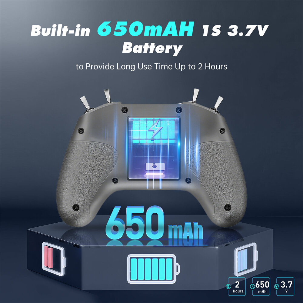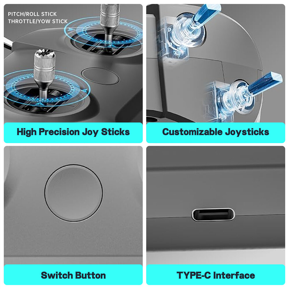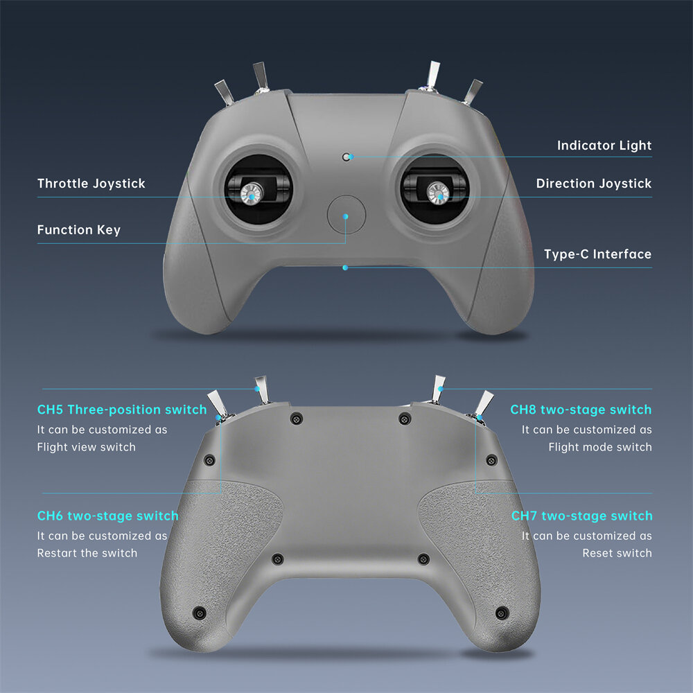 | C8 Controller | Channels: 8 channels Power Output: 100mW Control Distance: 1000 meters Operating Frequency: 2400-2500MHz Battery: 650mAh 1S battery Charging Port: Type-C Product Weight: 155g Product Dimensions: 162 * 120 * 66mm Charging Cut-off Voltage: 4.2V ± 0.02V Low Voltage Warning: 3.4V Flight Time: ≤2.5 hours Charging Time: 2 hours Input Voltage: 5V Input Current: 1A Simulator Functionality: Supported Compatible Aircraft Models: Fixed-wing aircraft, multi-rotor drones, gliders, applicable to global drones, cars, boats, etc., equipped with the ELRS protocol. Compatible Simulator Software: Liftoff, DRL, DCL, AI Drone Simulator, TRY P FPV, Uncrashed, Freerider (Velocidrone), FPVLogic, SkyDive, FPV Worldwide, FPV Battleground, Black Sheep. |