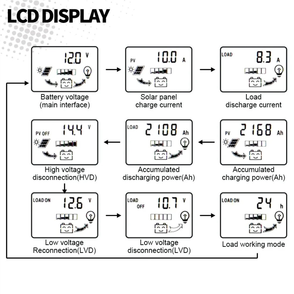1.Advanced MPPT Efficiency Harness the power of cutting-edge MPPT technology with a detection capability that maximizes charging current and boosts energy transfer, achieving up to 99% tracking efficiency for optimal performance. 2.Comprehensive Battery Safeguards Protects your battery system with multi-layer features, including overcharge prevention, discharge protection, reverse polarity safeguards, and reverse charging block during nighttime operation. 3.Versatile Compatibility Designed to auto-recognize 12V/24V battery setups, and compatible with both lead-acid and lithium battery types, providing flexibility for diverse renewable energy systems. 4.Reliable Charging Management Employs efficient 3-stage PWM technology to optimize charging processes, extend battery lifespan, and enhance overall energy system reliability for extended use. 5.Enhanced System Visibility Features an LCD screen to accurately display real-time data such as voltage, current, temperature, and other key parameters while ensuring easy operation and monitoring.
