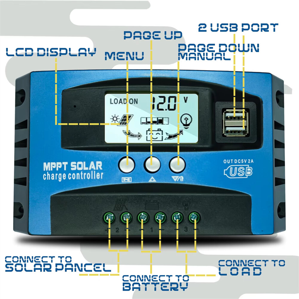 Battery Voltage: Automatically adapts to 12V/24V systems. Output Current: 60A / 80A / 100A. USB Output: 2 way USB output, 5V/2.5A Self-consume: <10mA Operating temperature: -35℃~60℃ Display: LCD screen with real-time data. Charging Technology: Advanced MPPT tracking with 99% efficiency. Battery Compatibility: Supports lead-acid and lithium batteries. Temperature Compensation: Automatic adjustment of charging voltage based on ambient temperature. Protection Features: Reverse polarity, short circuit, overload, open-circuit, and thunder protection. USB Output: Dual USB port for auxiliary devices.