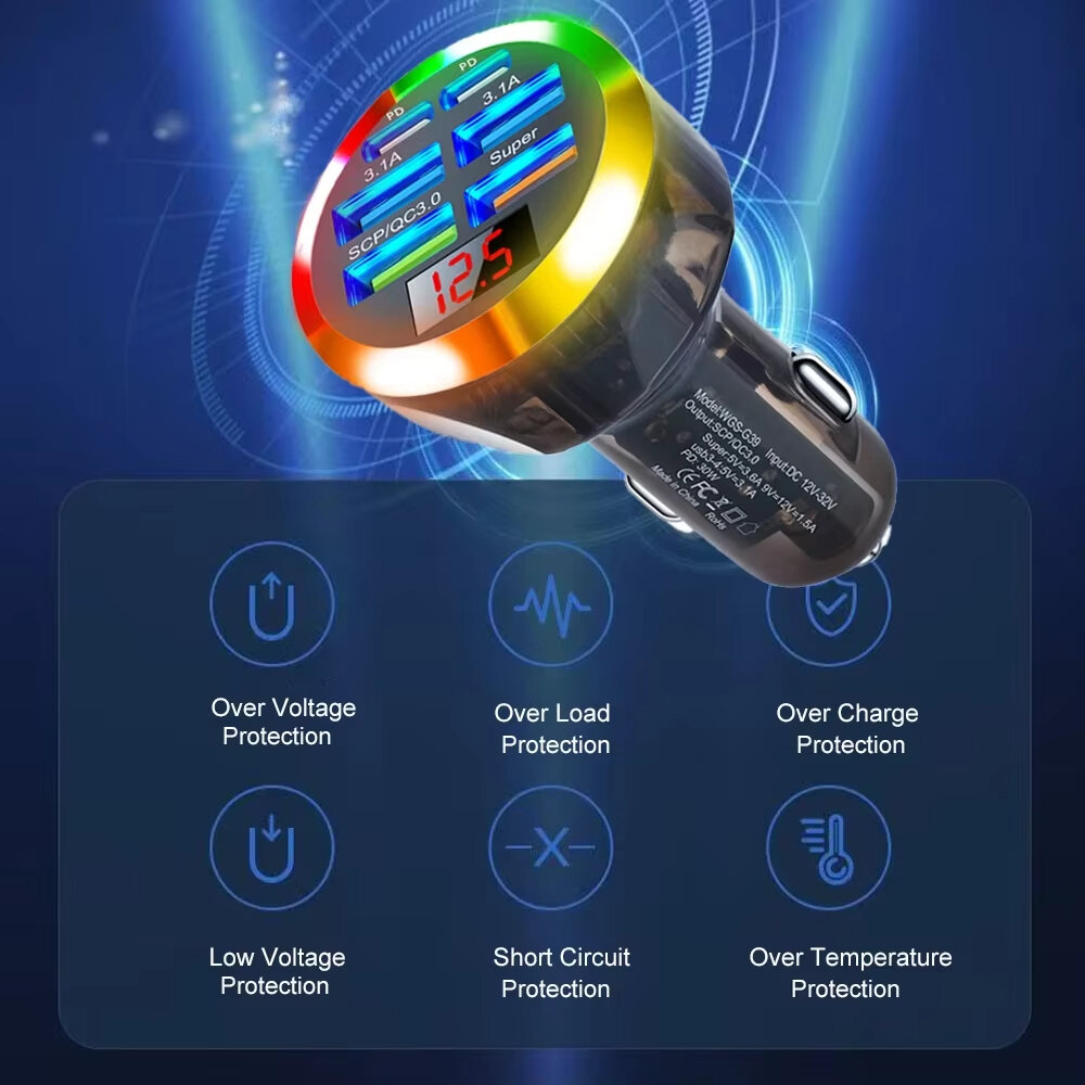 1. 6-in-1 Super Fast Charging: Equipped with six ports, including two PD, it enables simultaneous charging of multiple devices at ultra-fast speeds. Compatible with iOS and Android devices.