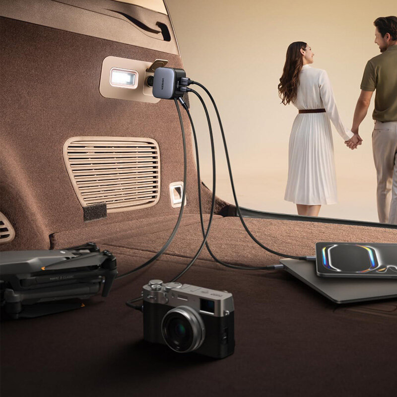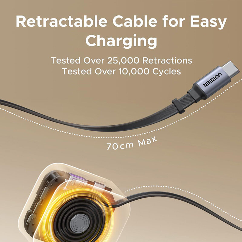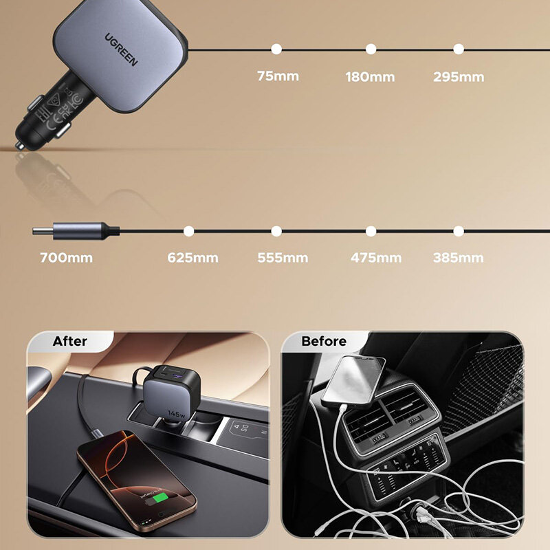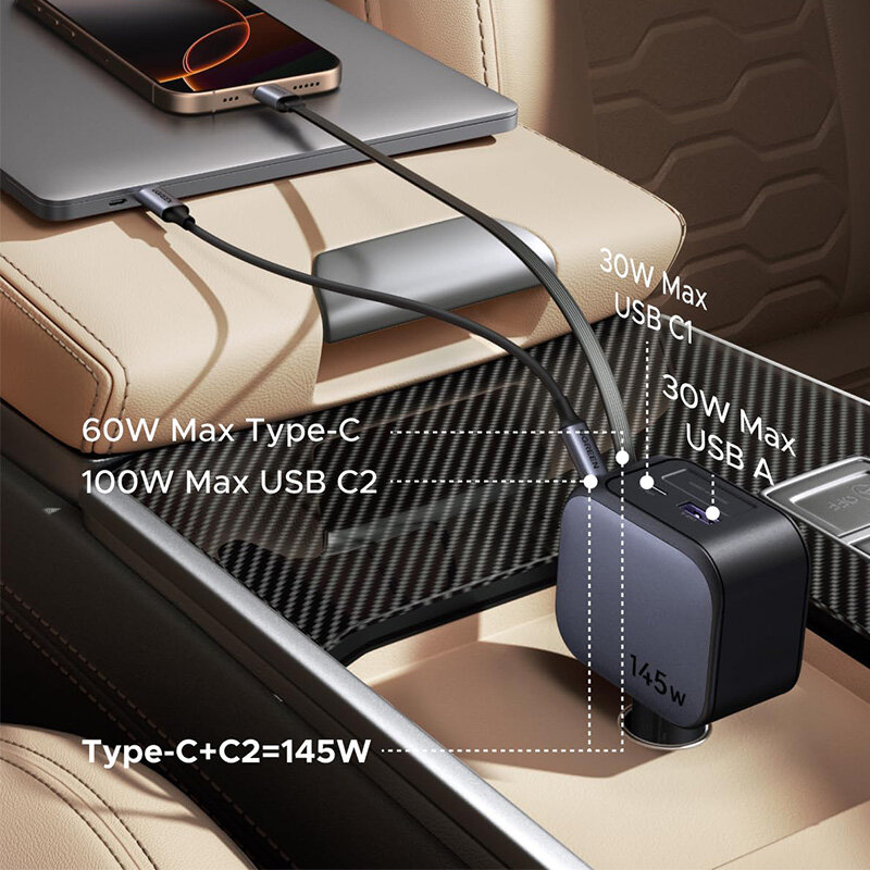 1. 60W Retractable USB-C Cable: This UGREEN car charger features a built-in retractable USB-C charging cable that supports 60W fast charging for laptops and phones. The cable can extend up to 70cm and lock securely at any point according to your needs, delivering precise length control for tangles-free charging. 2. 145W Fast Charging: This retractable car charger offers a maximum output of 145W when the built-in cable and the USB-C2 port are used simultaneously. When used alone, the USB-C2 port supports 100W, while both the USB-C1 and USB-A ports can deliver 30W. 3. 4-in-1 Car Charger: This cigarettes lighter USB charger allows you to fast charge 4 devices simultaneously, supports multiple charging protocols like PD 3.0, QC 3.0, PPS, SCP, AFC, etc. This car charger can intelligently adjust power output to match connected devices, which can better protect your device"s battery. 4. Compact and Neat Design: This car phone charger is incredibly compact and portable. The built-in retractable cable keeps your car interior neat and uncluttered, which is better for maintaining an organized driving environment. 5. Wide Compatibility: The car charger adapter works with almost all 12-24V vehicles and is compatible with laptops like MacBook Pro, Surface Pro, Chromebook, phone series like for iPhone 16/15, Galaxy S24/23, and other devices like for iPad, iPods, Dash Cameras, etc.
