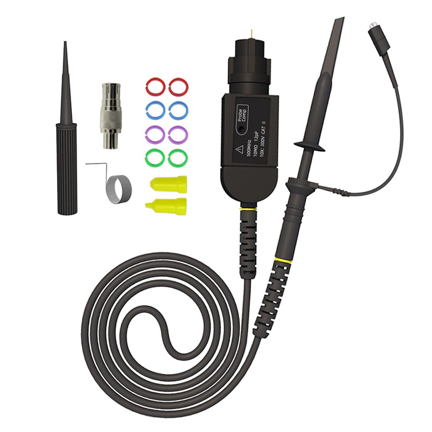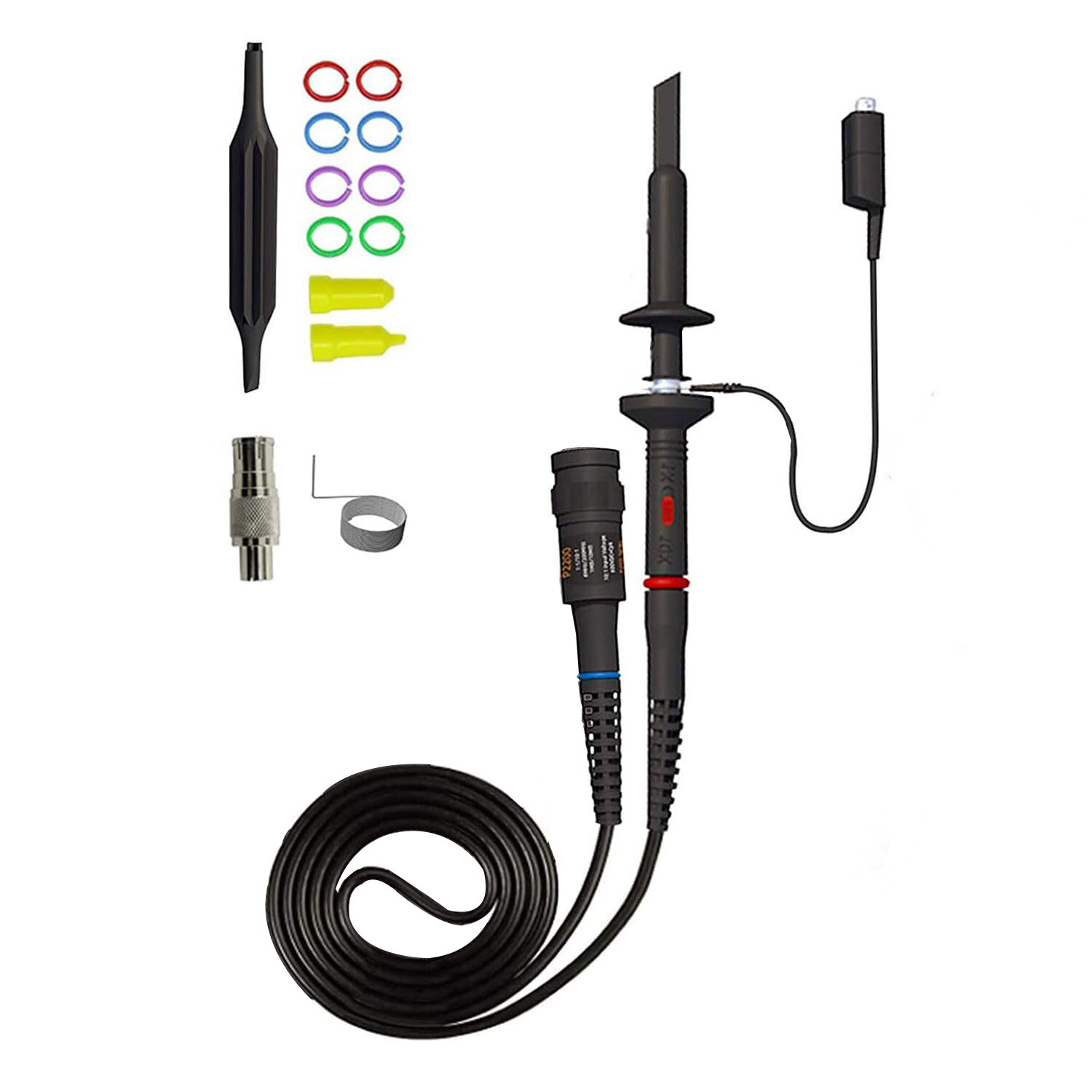 2 x Oscilloscope Probe 2 x Protective Cap 8 x Color Ring 1 x Regulating Rod 1 x BNC to Double-Headed Alligator Clip Test Line 1 x BNC to Double-Head Test Hook Test Line 1 x BNC to Double-Stack Test Line 1 x Double-Headed BNC Coaxial Line