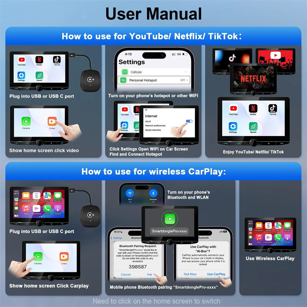 2. Streaming Capability: Supports Netflix, YouTube, and TikTok directly on the car screen for in-vehicle entertainment.