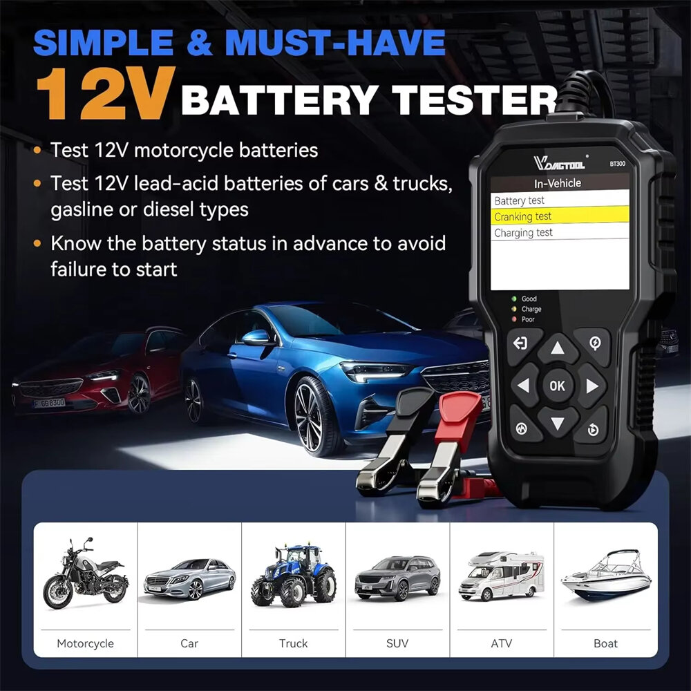 CHARGING & CRANKING TESTS: VDIAGTOOL BT300 car battery tester and alternator tester can also perform cranking test of the vehicle starter motor and check whether it's cranking properly or not, charging test of the alternator to prevent overcharge or incomplete charge.
