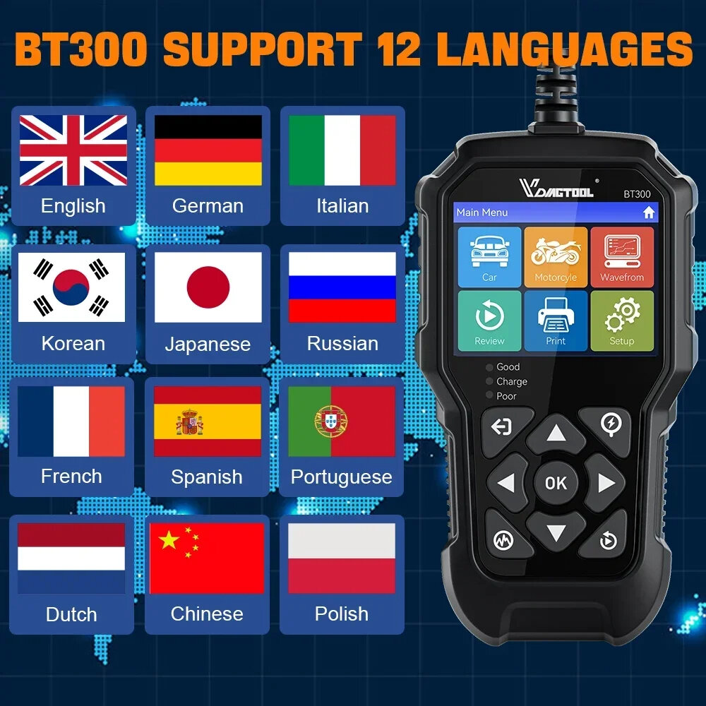 VDIAGTOOL BT300 support 12 languages: You can choose the language free that you want,VDIAGTOOL BT300 can support English, Simplified Chinese, Japanese, Korean, French, German, Polish, Russian, Spanish, Italian, Portuguese, Dutch.
