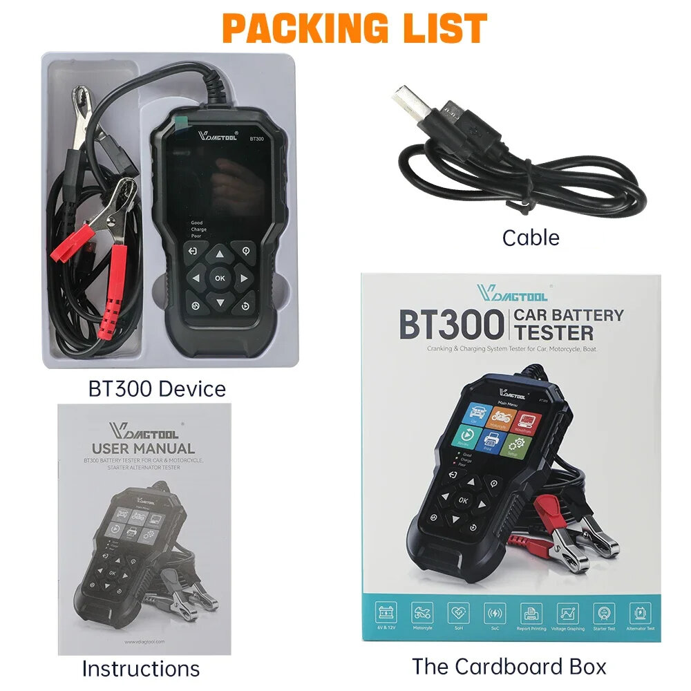 Package included: 1 x BT300 Car Battery Tester 1 x Manual 1 x Cable