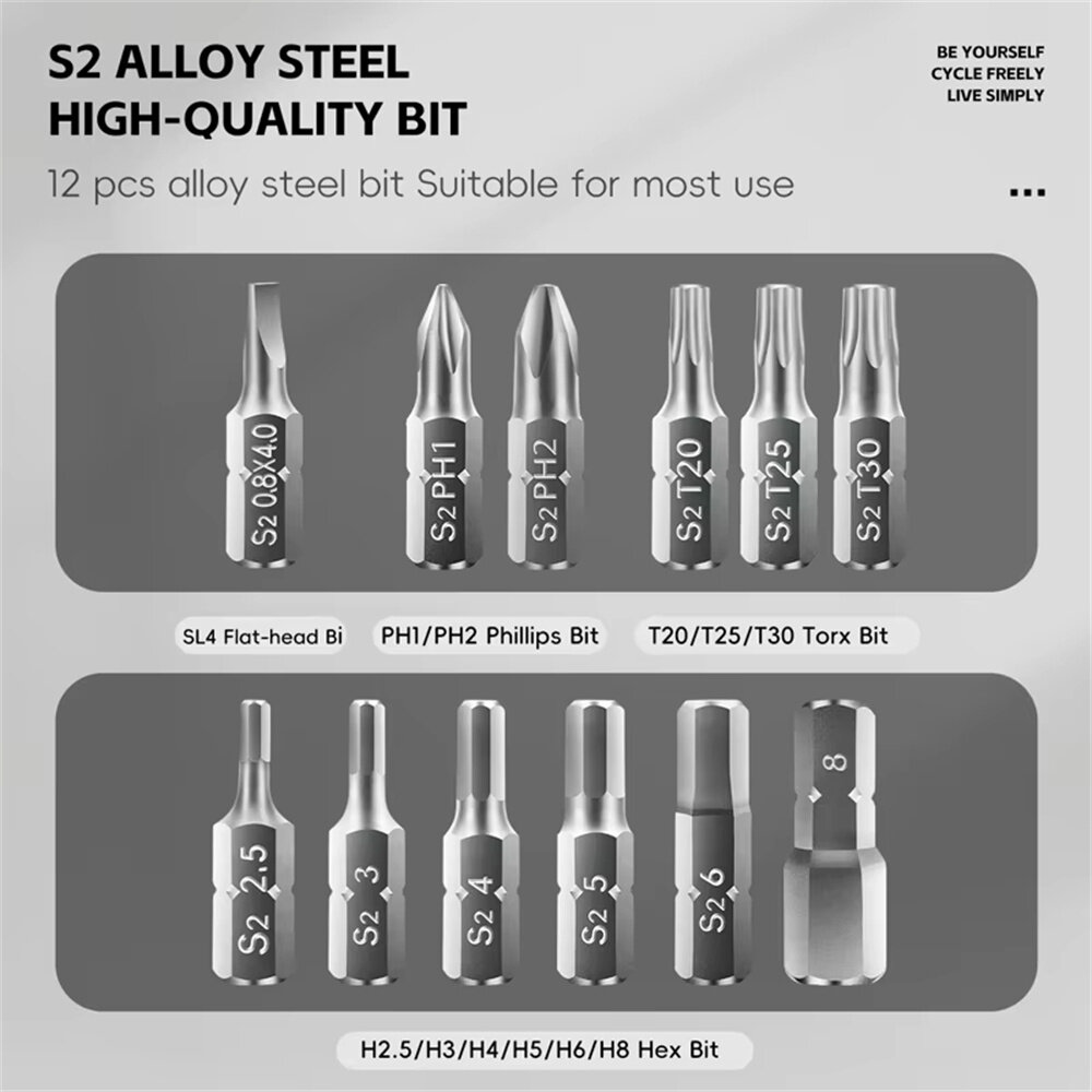 | Material | Bit: S2 Ratchet Wrench: 7-series Aluminum Alloy L-type Wrench: Cr-V Steel SpokeWrench: Carbon Steel Plastic Parts: Nylon / PC |
