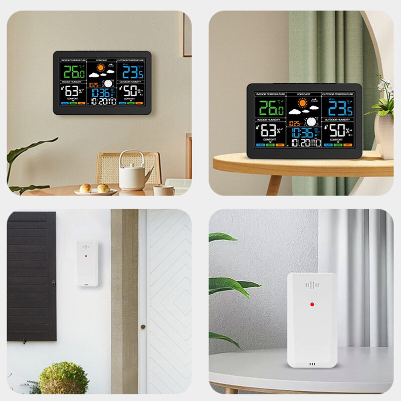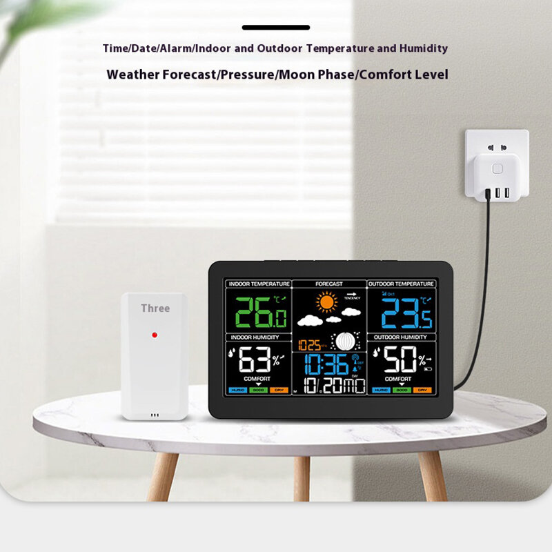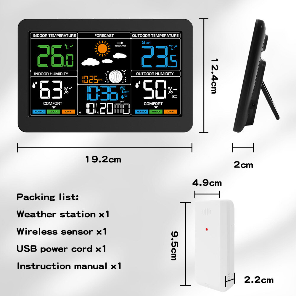u25ba7 buttons: MODE, UP, DOWNSNZ/LIGHT ALERT, CH, ALARM. u25ba4-level dynamic weather display: Sunny, Sunny to Cloudy, Cloudy, Light Rain. u25baDefault time: 12:00 (time format: 12-hour clock). u25baDefault date: 1/1 (year: 2019, date format: M/D). u25baDefault day of the week: TU (language: EN, 7 languages u200bu200bselectable: English, German, Italian, French, Spanish, Dutch, and Danish). u25baDefault temperature: °F, temperature display format selection (C/F). u25baMoon phase display, showing the moon"s shape for the day. u25baBarometer unit: hPa/inHg. u25baDefault alarm time: 12:00, default snooze time: 5 minutes. u25baIndoor temperature display range: 32°F to 122°F (0°C to 50°C). Temperature resolution: ±0.18°F. u25baOutdoor temperature display range: -40°F to 158°F (-40°C to 70°C). Temperature resolution: ±0.18°F. u25baIndoor and outdoor humidity range: 10%-99%, humidity resolution: ±1%RH. u25baThree-level backlight: Very bright, Medium bright, Off. u25baIndoor and outdoor maximum and minimum temperature alarms. u25baThe screen will indicate when the main unit or transmitter battery is low to prevent interruptions. u25baPower supply: Main unit: 3 x 1.5V "AAA" batteries (not included) or USB power cable, transmitter: 2 x 1.5V "AAA" batteries (not included). u25baDC5.0V 1A input. u25baLow-battery indicator.