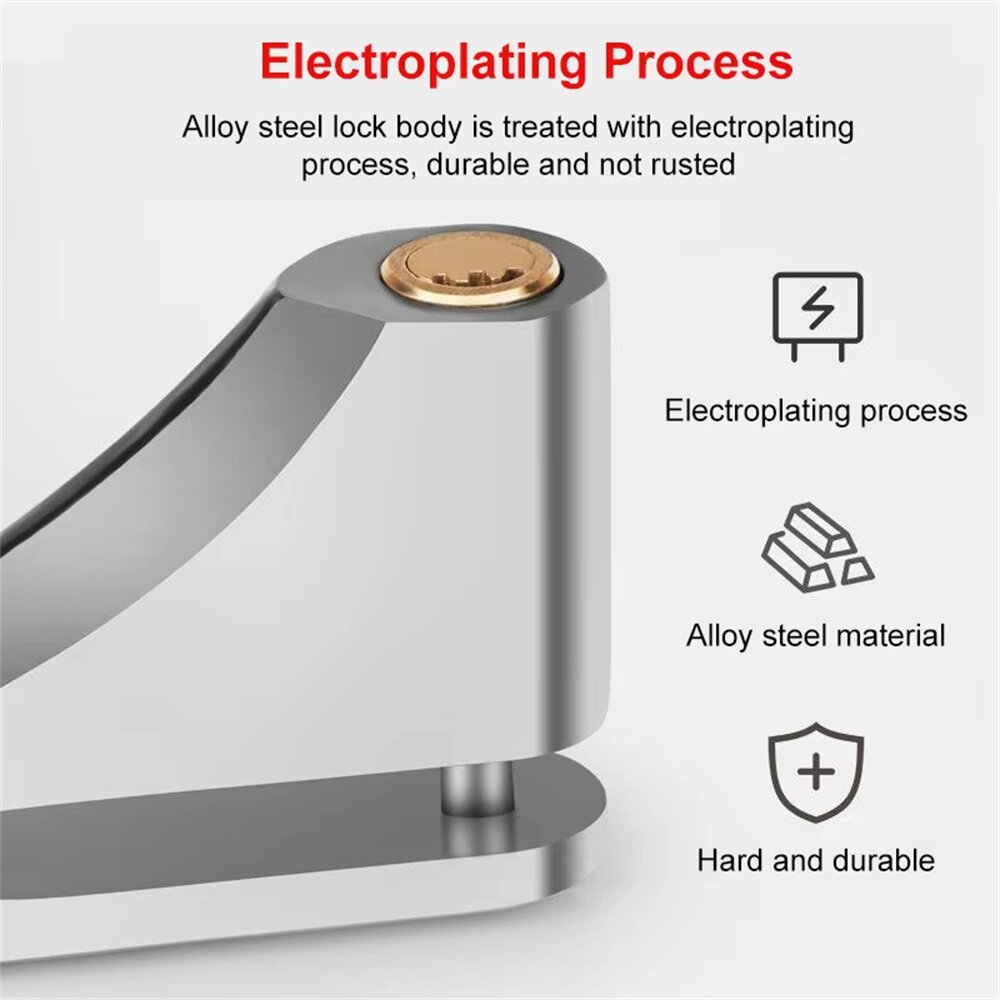 Features: 1.u3010Anti-theft Functionu3011The internal structure of the lock is made of special multi-layer structure, attached to the disc, it is hard to remove without a key, excellent anti-theft function, no need to worry about the car being stolen. 2.u3010Quality Materialu3011Motorcycle disc brake lock is made of high-quality alloy steel material, the outer layer of the electroplating process, rustproof and waterproof, hard and long-lasting, resistant to external damage, not easy to be damaged, long service life. 3.u3010Applicationu3011Anti-theft wheel padlock is suitable for motorbikes, electric cars and bicycles, etc. 4.u3010Easy to Useu3011The brake lock is easy to use, just insert the lock into the hole of the disc brake and press to lock, say goodbye to tedious work. 5.u3010Easy to Carryu3011This motorbike disc brake lock is small and portable, easy to carry out of the house, perfect replacement for old or damaged brake locks. Package includes: 1 x Disc Brake Lock 2 x Keys
