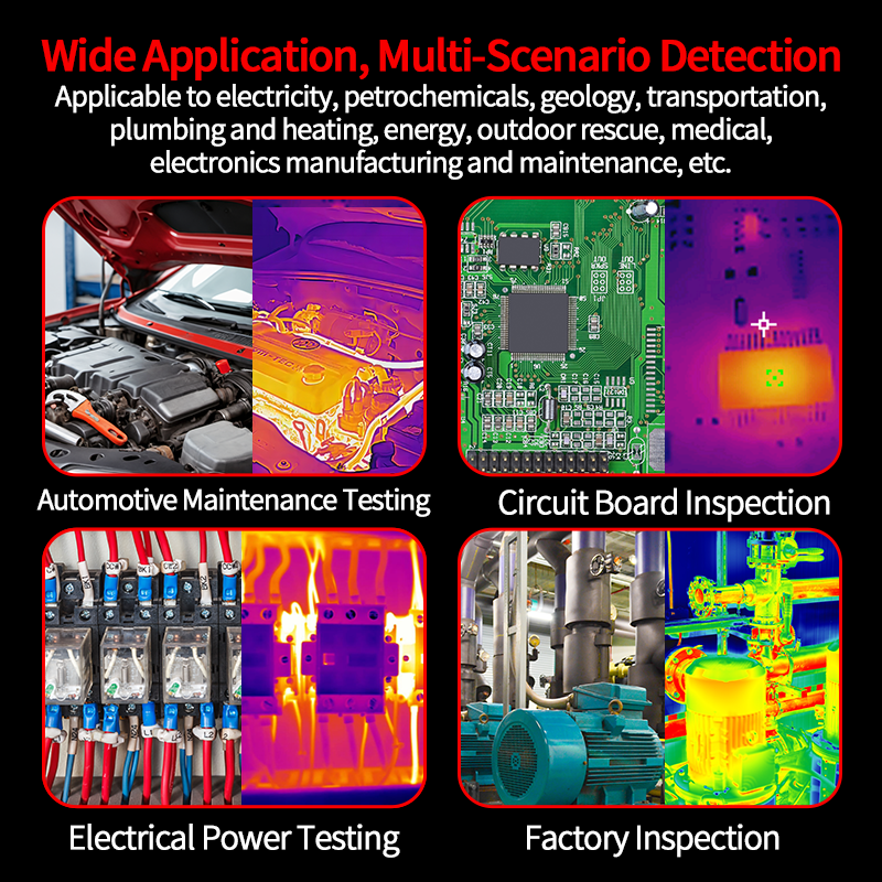 1.Wide Temperature Range Capable of handling extreme temperatures from -20°C to 550°C, this thermal imaging device is suitable for both low-temperature environments and high-temperature scenarios, ensuring versatile application use. 2.Adjustable Emissivity Settings Emissivity range from 0.01 to 1.00 allows precise thermal imaging for different materials, optimizing accuracy and adaptability for professional measurements. 3.Compact TFT Display Equipped with a 2.4-inch TFT display, featuring 320x240 resolution, providing clear and detailed imagery for quick analysis and real-time temperature readings. 4.Multi-Color Palette Modes The thermal imaging tool integrates multiple color palette options, including Rainbow, White Hot, Iron Red, and Fusion, for visualization flexibility tailored to specific tasks. 5.Portable Design with USB-C Charging Lightweight and powered by a rechargeable Lithium battery via USB-C, offering ease of mobility and long-lasting performance for on-the-go operations.